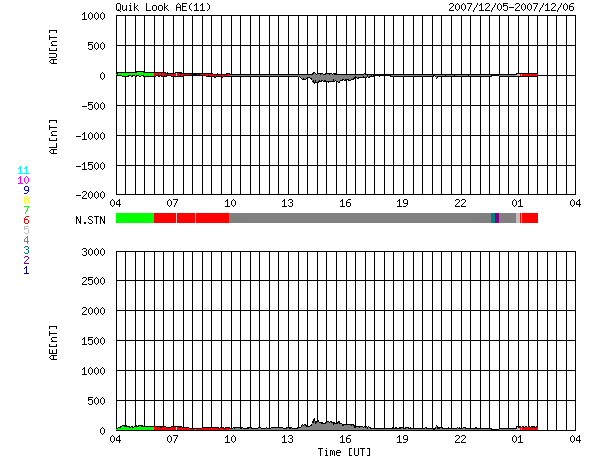 下段のAEグラフの値が高くなると、オーロラ活動が活発化しています。