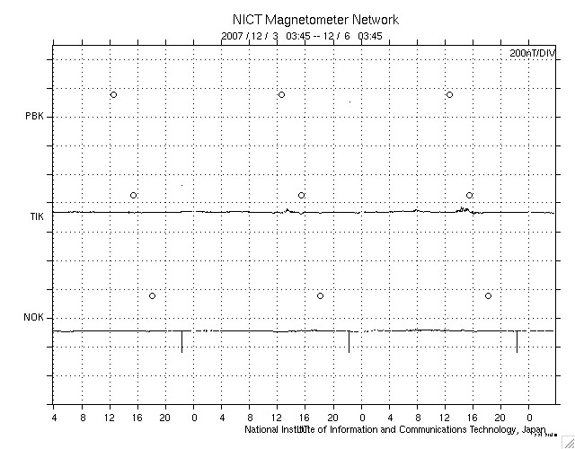 2007/12/ 4 09:55 太陽風は一段と低速になっています(300km/秒)。磁気圏もたいへん穏やかです。