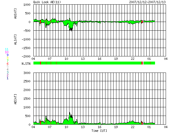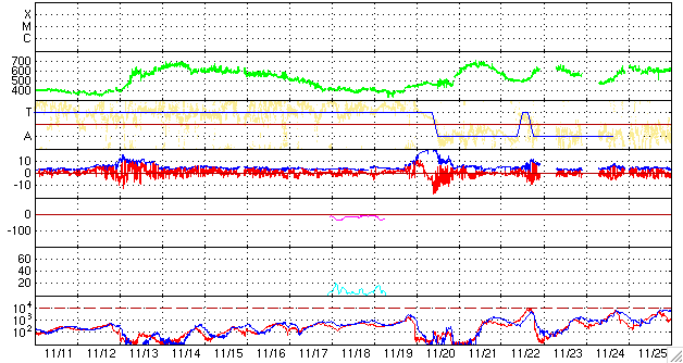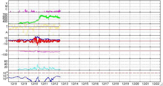 ACEが観測した太陽風の磁場(1番上の枠、白線は全体の強度、赤線は南北成分) および、太陽風の密度(3番目の橙線)、速度(4番目の黄線) (c) NOAA/SWPC ![]() リアルタイムAE指数 下段のAEグラフの値が高くなると、オーロラ活動が活発化しています。 (c) 京都大学, NICT ![]() シベリアで観測された3日間の磁場データ 右側の3分の1が、昨日のデータになります。グラフが上がったり下がったりすると、オーロラ活動が活発化しています。 (c) NICT ![]() 27日の太陽周期に合わせたデータプロット 太陽が同じ面を地球に向けていた27日前の変化から、今後を予想することができます。 (c) NICT