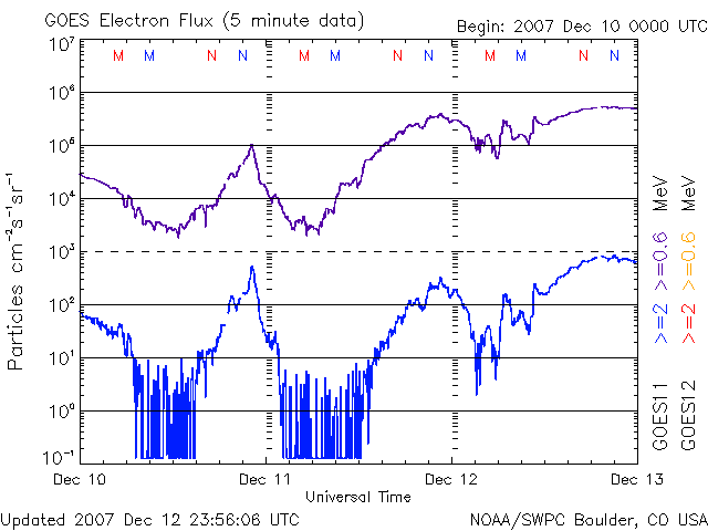 2007/12/13 12:54 更新 高速の太陽風が続いています(550km/秒)。磁気圏は比較的穏やかです。 担当 篠原 高速の太陽風が続いています。 速度としては、低下の傾向にあるようで、 昨日までは600km/秒台を保っていましたが、今朝に入って550km/秒に下がって来ています。 磁場強度は5nTを保っていて、まだ弱まってはいません。 このため、速度が本格的に下がるのは、もう少し先になるのではないかと思います。 27日周期の図を参考にすると、今日いっぱいは高い速度が続き、 速度の低下は明日に入ってからとなりそうです。 速度は高い状態が続いていますが、磁気圏の活動はそれほどでもありません。 AE指数では、中・小規模の変化がいくつか見える程度で、 特に、図の後半はかなり落ち着いています。 太陽風の磁場が、北寄り(赤線がプラス側)になっているためでしょう。 今後は、速度、磁場ともに穏やかになって行く傾向にありますので、 磁気圏の乱れも起こりにくくなります。 今後の予想ですが、太陽風の高速状態は明日(14日)くらいまでではないかと思います。 15,16日と一休みして、17日から次の高速風がやって来そうです。 SOHO EIT195の写真を見てください。 太陽の南東(左下)に、くさび状の鋭い形をしたコロナホールが見えています。 明日くらいにコロナホールが太陽の中心に達し、 その3日後、17日くらいに影響が地球にやって来ると予想できます。 放射線帯の高エネルギー電子は、増加はしていますが、1000のレベルまでで、 警戒域には達していません。 高速風も後半に入っていますので、今回はこれ以上大きく増えることはないでしょう。 太陽では、978黒点群が複雑な姿を見せています。 しかし、フレア活動は無く、太陽は穏やかな状態が続いています。 太陽観測衛星「ひので」のホームページで、 この黒点群の拡大写真が公開されています。 今日のニュースに縮小したものを掲載します。 しかし、オリジナルはもっと大きな写真ですので、ぜひリンク先の写真をクリックして、 オリジナルの迫力を楽しんでください。 ひのでが撮影した978黒点群。12月12日18時(世界時12日9時)。 (c) 国立天文台/JAXA ![]() SOHO衛星のEIT195カメラの映像 (c) SOHO (ESA & NASA)