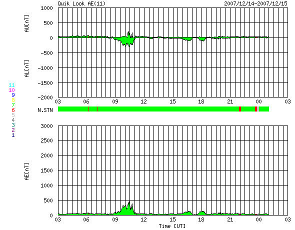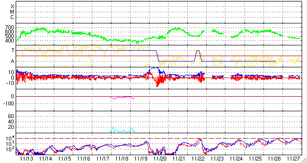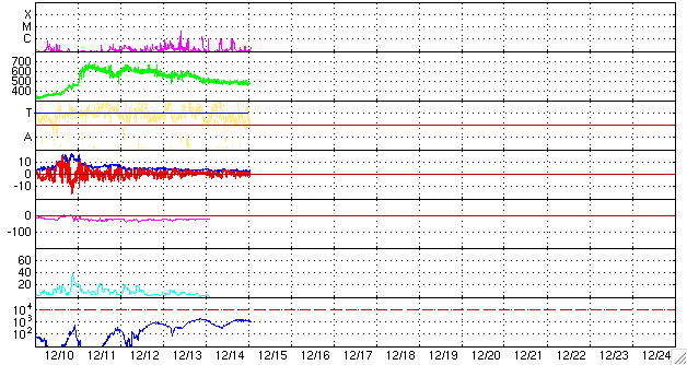 ACEが観測した太陽風の磁場(1番上の枠、白線は全体の強度、赤線は南北成分) および、太陽風の密度(3番目の橙線)、速度(4番目の黄線) (c) NOAA/SWPC ![]() リアルタイムAE指数 下段のAEグラフの値が高くなると、オーロラ活動が活発化しています。 (c) 京都大学, NICT ![]() シベリアで観測された3日間の磁場データ 右側の3分の1が、昨日のデータになります。グラフが上がったり下がったりすると、オーロラ活動が活発化しています。 (c) NICT ![]() 27日の太陽周期に合わせたデータプロット 太陽が同じ面を地球に向けていた27日前の変化から、今後を予想することができます。 (c) NICT