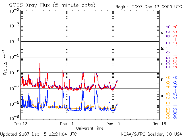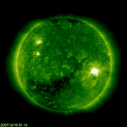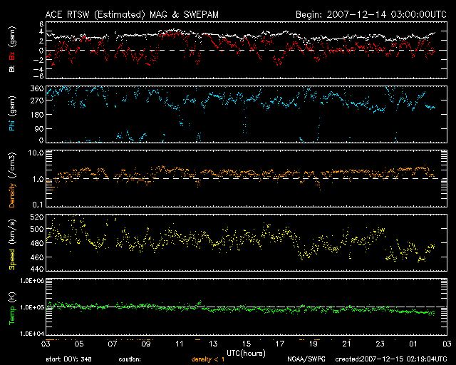 2007/12/15 11:22 更新 やや高速の太陽風が続いています(460km/秒)。大きなコロナホールが見えています。 担当 篠原 太陽風は、やや高速の状態が続いています。 昨日500km/秒を割りましたが、その後もそれほど速度が下がらず、 現在も460km/秒とやや高めの速度が続いています。 磁場強度は3nTに弱まったままです。 磁気圏活動は、概ね穏やかです。 AE指数で300nTの小規模の変化がひとつ見えていますが、その他は変化がありません。 太陽風の速度はある程度あるのですが、 磁場が弱まっているので、目立った南向きになることがないためでしょう。 この後も、明日にかけては基本的に穏やかな状態が続くでしょう。 太陽風の速度は、ゆっくりと下がって行くと思われます。 一旦、通常の速度レベルに戻って、 17日か18日から再び高速太陽風がやって来ると予想しています。 高速風の発生源であるコロナホールは、 SOHO EIT195の写真で、太陽の南半球側に大きく広がっています。 これだけ大きく広がったコロナホールを見るのは、久しぶりです。 ただ、高緯度側に広がっているので、 地球へ向けてどの程度高速風がやってくるのかは注目されます。 太陽では、978黒点群が大きな姿を見せています。 規模は縮小の方向に向かっている様です。 黒点の数、面積が減り、磁場の複雑さもβに下がっています。 ただし、X線のグラフでは、Cに届くか届かないかというレベルの、 小規模のフレア活動を起こし続けています。 引き続き、小中規模のフレアを起こす可能性は残っているようです。 このまま弱まって行くのか、活動を続けるのか、こちらも注目です。 SOHO衛星のEIT195カメラの映像 (c) SOHO (ESA & NASA)