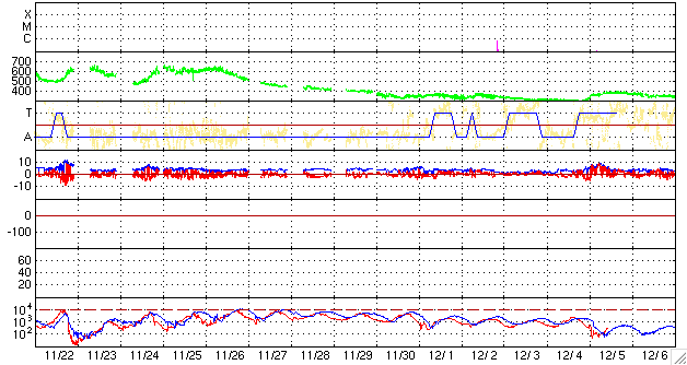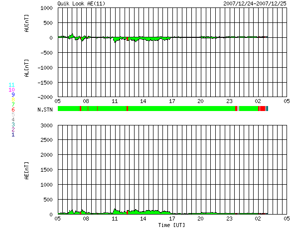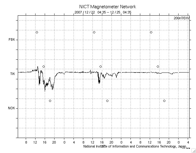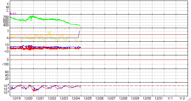 ACEが観測した太陽風の磁場(1番上の枠、白線は全体の強度、赤線は南北成分) および、太陽風の密度(3番目の橙線)、速度(4番目の黄線) (c) NOAA/SWPC ![]() リアルタイムAE指数 下段のAEグラフの値が高くなると、オーロラ活動が活発化しています。 (c) 京都大学, NICT ![]() シベリアで観測された3日間の磁場データ 右側の3分の1が、昨日のデータになります。グラフが上がったり下がったりすると、オーロラ活動が活発化しています。 (c) NICT ![]() 27日の太陽周期に合わせたデータプロット 太陽が同じ面を地球に向けていた27日前の変化から、今後を予想することができます。 (c) NICT
