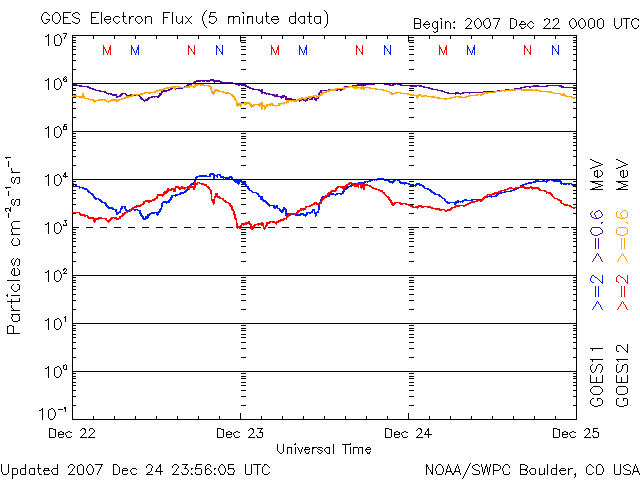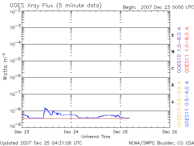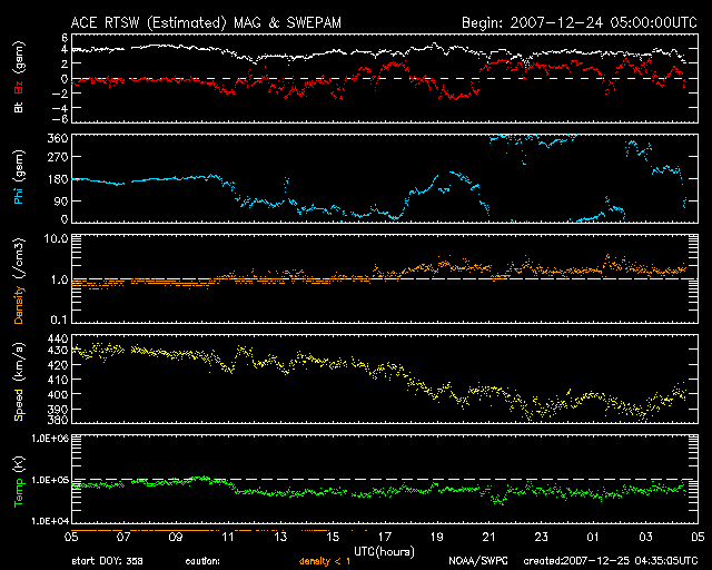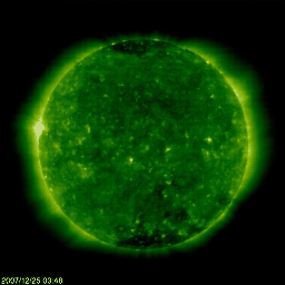 2007/12/25 13:36 更新 太陽風の速度は400km/秒に下がりました。磁気圏もとても静かです。 担当 篠原 太陽風の速度は400km/秒に下がりました。 高速の太陽風は終わって、普段の風に戻っています。 磁場強度も4nTで、普通の強さで落ち着いています。 27日周期の図で前回と比較すると、むしろ半日ほど早く高速風が終わった印象です。 磁気圏もすっかり静かになっていて、AE指数にはとても小さな変化しか見られません。 シベリアの磁場データを見ると、 この3日間に、日ごとに活動度が弱まっていたのがよく分かります。 これから、年内いっぱいはとても穏やかな状態が続くでしょう。 太陽風の速度は300km/秒台に下がって行きそうです。 1月1日くらいから、太陽風の速度に多少の増加が見られるかもしれません。 この期間は、前周期(12月5日〜)に小さな変化が見られていて、 これが今回どうなっているか注目しています。 そして、次の本格的な高速風は1月7日くらいから始まるでしょう。 それまでは、基本的には穏やかに過ぎて行くと思われます。 放射線帯の高エネルギー電子は、高めの状態が続いています。 減少はとてもゆっくりです。 太陽はとても穏やかです。 無黒点のままです。 SOHO衛星のEIT195カメラの映像 (c) SOHO (ESA & NASA)