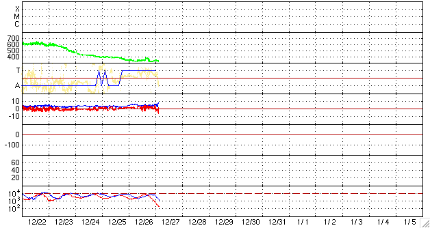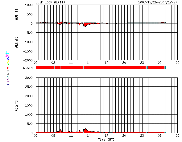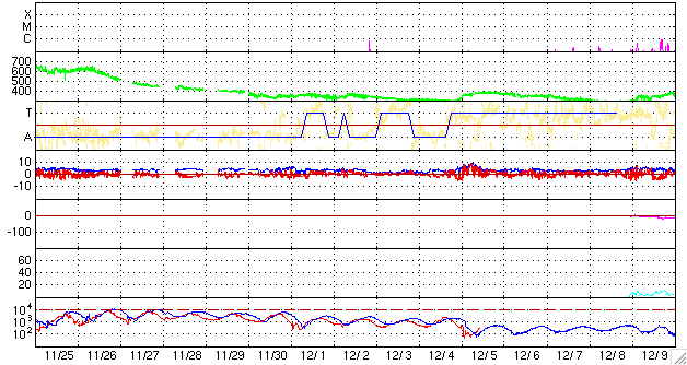 ACEが観測した太陽風の磁場(1番上の枠、白線は全体の強度、赤線は南北成分) および、太陽風の密度(3番目の橙線)、速度(4番目の黄線) (c) NOAA/SWPC ![]() リアルタイムAE指数 下段のAEグラフの値が高くなると、オーロラ活動が活発化しています。 (c) 京都大学, NICT ![]() シベリアで観測された3日間の磁場データ 右側の3分の1が、昨日のデータになります。グラフが上がったり下がったりすると、オーロラ活動が活発化しています。 (c) NICT ![]() 27日の太陽周期に合わせたデータプロット 太陽が同じ面を地球に向けていた27日前の変化から、今後を予想することができます。 (c) NICT