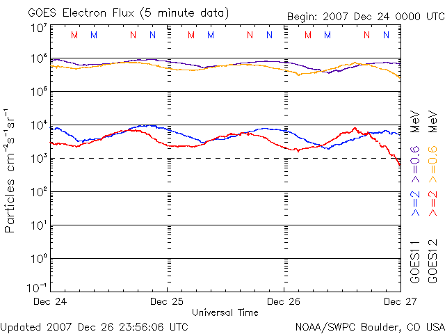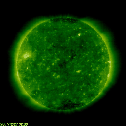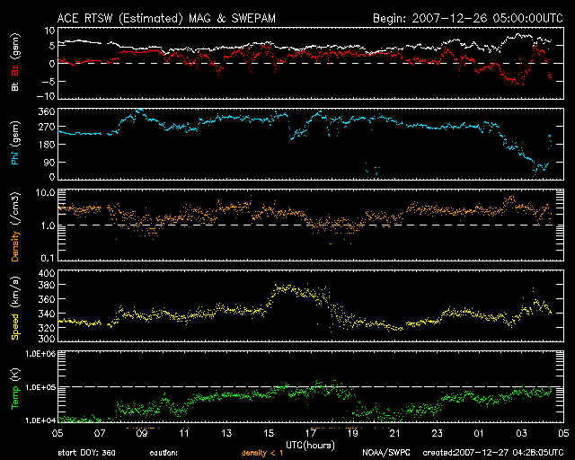 2007/12/27 13:28 更新 低速の太陽風が続いています(340km/秒)。磁気圏も穏やかです。 担当 篠原 340km/秒前後の低速の太陽風が続いています。 磁場強度も5nTと普通の強さで、穏やかな太陽風です。 磁気圏も静かな状態が続いています。 AE指数では、200nTほどのとても小さな変化がひとつ見えていますが、 他は全く変化がなく、静穏です。 ACEの図の最新(右端)を見ると、 磁場強度がやや強まったり、南北成分が南北に振れていたりしています。 太陽風磁場のセクターが変化している様で、 この影響で、小規模のオーロラ活動が見られるかもしれません。 太陽風も磁気圏も、基本的にはこのまま穏やかな状態が続くでしょう。 放射線帯高エネルギー電子は、次第に数を減らしています。 警戒レベルをはっきりと下回る様になりました。 太陽は、EIT195の東寄り(左寄り)にやや明るいところが見られますが、 黒点にはなっておらず、無黒点が続いています。 X線のグラフも最低のレベルに下がっています。 SOHO衛星のEIT195カメラの映像 (c) SOHO (ESA & NASA)