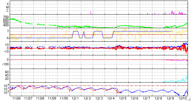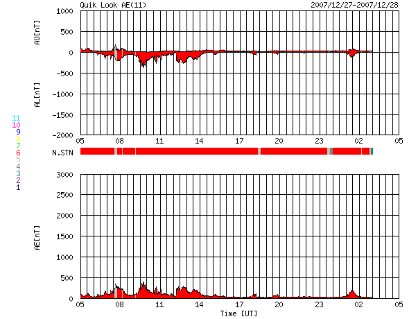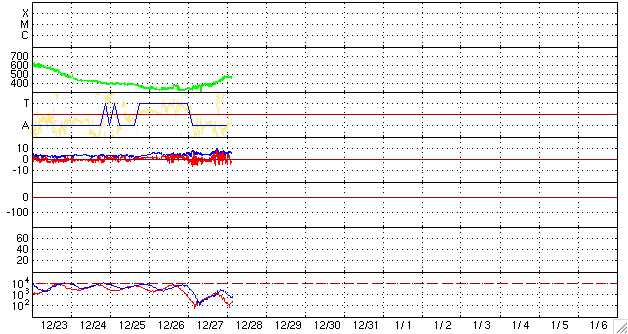 ACEが観測した太陽風の磁場(1番上の枠、白線は全体の強度、赤線は南北成分) および、太陽風の密度(3番目の橙線)、速度(4番目の黄線) (c) NOAA/SWPC ![]() リアルタイムAE指数 下段のAEグラフの値が高くなると、オーロラ活動が活発化しています。 (c) 京都大学, NICT ![]() シベリアで観測された3日間の磁場データ 右側の3分の1が、昨日のデータになります。グラフが上がったり下がったりすると、オーロラ活動が活発化しています。 (c) NICT ![]() 27日の太陽周期に合わせたデータプロット 太陽が同じ面を地球に向けていた27日前の変化から、今後を予想することができます。 (c) NICT