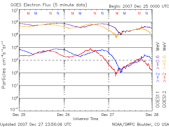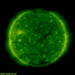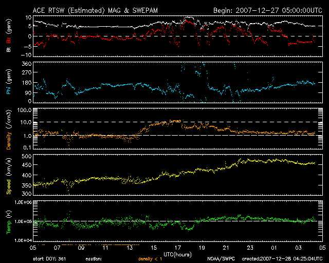 2007/12/28 13:26 更新 太陽風の速度が上がって、やや高速になっています。 担当 篠原 小規模ですが、太陽風の速度が上昇しています。 昨日は350km/秒の低速風でしたが、 28日0時(世界時27日15時)頃からゆっくりと速度が上がり始め、 今朝、28日7時(世界時27日22時)頃に470km/秒に上がりました。 その後、6時間ほど経っていますが、現在もやや高めの速度が続いています。 27日周期の図を見ると、この変化は前周期には見られなかったものです。 太陽風の分布が少し変化している様です。 SOHO EIT195の太陽写真を見ると、 太陽の中心やや右寄りに小さなコロナホールが見えています。 あるいは、ここからの影響が見えているのでしょうか。 太陽風の速度が、これ以上上がることはないだろうと思います。 現在の速度がどこまで続くでしょうか。 AE指数を見ると、磁気圏のオーロラ活動は小さなものが断続的に見られています。 図の前半に300nTくらいの小規模の変化が発生しています。 現在、太陽風磁場の南北成分が南北にひんぱんに振れているようです。 速度が上がっていることもあり、 この影響で小規模のオーロラ活動が発生する様になるかもしれません。 放射線帯の高エネルギー電子は、一気に数を減らしています。 この後は、穏やかな状態が続くでしょう。 太陽は無黒点のままで、非常に穏やかです。 SOHO衛星のEIT195カメラの映像 (c) SOHO (ESA & NASA)