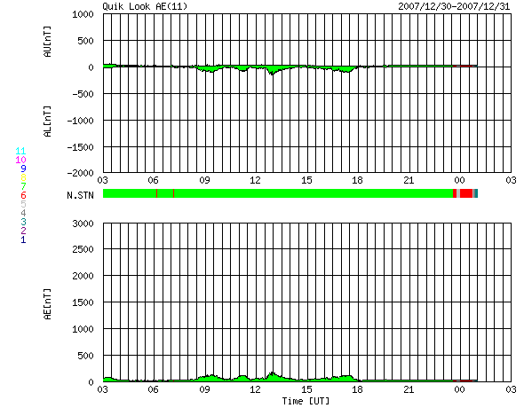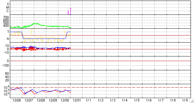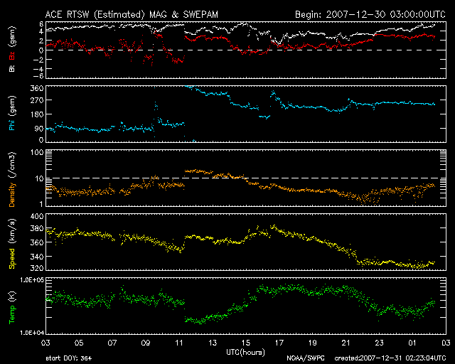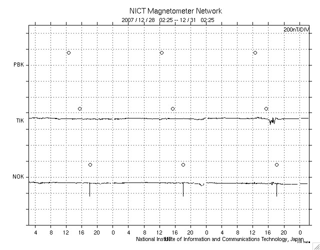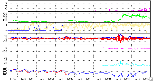 GOES衛星の太陽X線データ (c) NOAA/SWPC ![]() SOHO衛星のMDIカメラによる太陽黒点 (c) SOHO (ESA & NASA) ![]() ACEが観測した太陽風の磁場(1番上の枠、白線は全体の強度、赤線は南北成分) および、太陽風の密度(3番目の橙線)、速度(4番目の黄線) (c) NOAA/SWPC ![]() リアルタイムAE指数 下段のAEグラフの値が高くなると、オーロラ活動が活発化しています。 (c) 京都大学, NICT ![]() シベリアで観測された3日間の磁場データ 右側の3分の1が、昨日のデータになります。グラフが上がったり下がったりすると、オーロラ活動が活発化しています。 (c) NICT ![]() 27日の太陽周期に合わせたデータプロット 太陽が同じ面を地球に向けていた27日前の変化から、今後を予想することができます。 (c) NICT