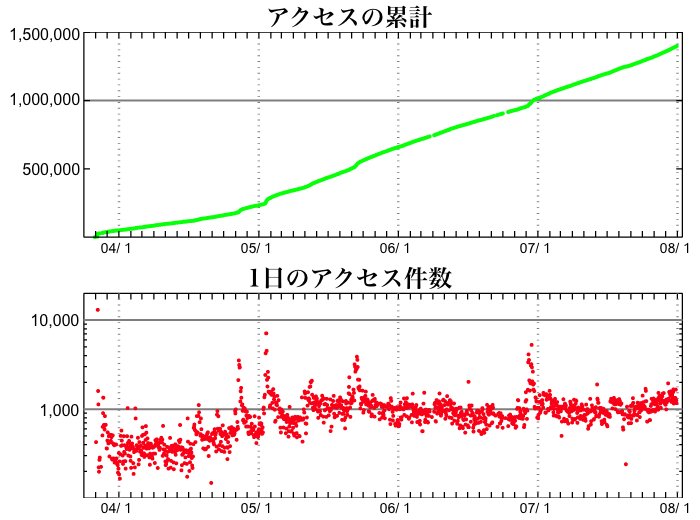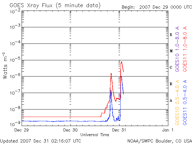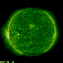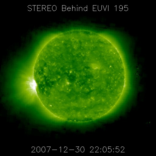 2007/12/31 11:25 更新 太陽の東端で、C8の小規模フレアが発生しました。太陽風、磁気圏は穏やかです。2007年のアクセス数をまとめます。 担当 篠原 いよいよ2007年も今日で最後となりました。 今年も1年間、宇宙天気ニュースをお読みいただいてありがとうございました。 今年最後の記事として、開設後約4年間の、 宇宙天気ニュースへのアクセス状況を報告したいと思います。 1枚目に掲載している図の上半分は、アクセスの累計グラフです。 ちょうど1年前の2006年12月に、100万件を突破しましたが、 今日で、累計が140万件を突破しそうです。 この1年間で約40万件のアクセスがあったことになります。 日々のアクセスの動向を示すのが、下半分のグラフです。 このグラフは、縦軸を対数表示にしています。 数値の増え方が不規則ですので、注意して見てください。 2007年の1日あたりのアクセス件数は、1000件を上下するレベルで推移しました。 過去の2003年から2006年の期間を見ると、 突発的なアクセス件数の増加が度々起こっています。 これは太陽で大爆発が発生し、大規模な磁気嵐が発生するなどして、 急に宇宙天気情報への関心が高まったことによるものです。 ところが、2007年は、とうとう1年間このようなアクセスの急増は見られませんでした。 今年がいかに穏やかだったかというのがよく分かります。 このように、目立った事件がほとんどなかったにも関わらず、 今年1年間、安定してアクセスが続いたことにたいへん感謝しています。 おかげさまで、今年も宇宙天気ニュースを続けることができました。 太陽は、いよいよ新しい活動周期に入ったと思われます。 2008年は、活動が次第に盛り上がって行く様子を、 じっくりとお伝えして行きたいと考えています。 今後も息長く、よろしくお願いします。 さて、2007年の最後を飾るかの様に、太陽で急にフレアが発生しました。 31日9時半(世界時31日0時半)に、C8.3の大きめの小規模フレアが観測されました。 その少し前にも、C1.7の小規模フレアが起きています。 太陽の東端の、まだ上がっていない活動領域で起こったものです。 フレアの上部しか見えていないので、本当の規模はもう一段大きかったと考えられます。 地球よりも1日分ほど先回りしている、STEREO Behindの写真を掲載します。 こちらのカメラでは、ぎりぎりで視野に入って来ている様です。 この様子だと、ここにある黒点群が地球で見える様になるのは、 2日くらい先になりそうです。 この活動領域は、今月上旬に久しぶりに大きな姿を見せていた、 978黒点群の回帰ではないかと思います。 裏側の2週間を生き延び、活動度を保っていた様です。 東端に上がるや否やフレアを起こしたというのは、ちょうど1年前の事件を思い出します。 しかし、今回の活動領域は、あの様な大爆発を起こすほどの規模ではないでしょう。 視野に入って来て、黒点の様子が分かる様になるのが楽しみです。 さて、太陽風はもう一段速度が下がって、330km/秒とかなり低速の風になっています。 とても穏やかな風です。 地球の磁気圏も概ね穏やかで、 AE指数にはとても小さな変化がちらちらと見えている程度です。 太陽のフレア活動が注目されますが、 太陽風、磁気圏に関しては、穏やかな年越しとなるでしょう。 2007年12月までの、宇宙天気ニュースのアクセス状況。 (c) 宇宙天気ニュース ![]() STEREO衛星が撮影した、太陽コロナの写真。東端にこれからやってくる活動領域が明るく見えています。 (c) NASA ![]() SOHO衛星のEIT195カメラの映像 (c) SOHO (ESA & NASA)