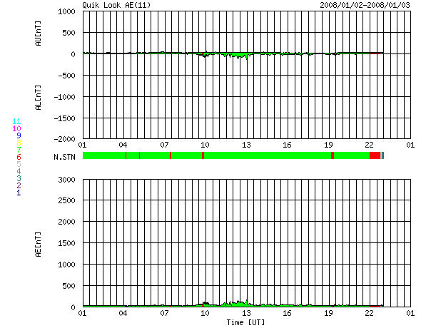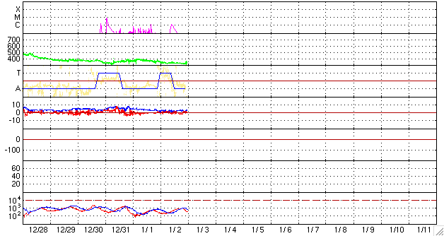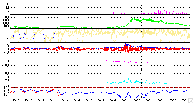 SOHO衛星のMDIカメラによる太陽黒点 (c) SOHO (ESA & NASA) ![]() GOES衛星の太陽X線データ (c) NOAA/SWPC ![]() ACEが観測した太陽風の磁場(1番上の枠、白線は全体の強度、赤線は南北成分) および、太陽風の密度(3番目の橙線)、速度(4番目の黄線) (c) NOAA/SWPC ![]() リアルタイムAE指数 下段のAEグラフの値が高くなると、オーロラ活動が活発化しています。 (c) 京都大学, NICT ![]() シベリアで観測された3日間の磁場データ 右側の3分の1が、昨日のデータになります。グラフが上がったり下がったりすると、オーロラ活動が活発化しています。 (c) NICT ![]() 27日の太陽周期に合わせたデータプロット 太陽が同じ面を地球に向けていた27日前の変化から、今後を予想することができます。 (c) NICT