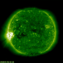 2008/ 1/ 3 09:10 更新 C1.3の小規模フレアが起こりました。太陽風、磁気圏はとても穏やかです。 担当 篠原 元日に公開しましたが、お正月特別ページを作成しています。 どうぞご覧下さい。 新しい太陽周期の始まりか? 昨日、2日17時(世界時2日8時)に、C1.3の小さな小規模フレアが発生しました。 発生場所は、太陽の東端に見える980黒点群です。 X線のグラフが、ゆっくりと立ち上がり、ゆっくりと弱まって行く、 長時間型のフレアでした。 このため、同時にCME(太陽ガスの放出現象)が発生しています。 SOHO LASCO C3カメラの連続写真をご覧下さい。 噴き出した方向は、地球から見てほぼ真横でした。 このため、太陽風の乱れなど、地球への影響はないでしょう。 980黒点群は、黒点としては数も少なく、小さな群に見えますが、 その割に活動度が高めの様です。 SOHO EIT195のコロナ写真でも、 この領域は、明るい部分が黒点群の規模以上に広がっている印象です。 NOAAでは、今後、中規模フレアを起こす可能性もあると見ています。 そして、EIT195の写真では、980群の向こう側にも明るい領域があるように見えます。 続いて別の黒点群が上がってくるのかもしれません。 太陽風は、穏やかな状態が続いています。 速度は330km/秒で安定し、磁場強度も3nT前後でやや弱い状態です。 このため、磁気圏はかなり静穏で、 AE指数、シベリア磁場データには全く変化が見られません。 太陽風と磁気圏は、このまま、5-6日頃までは静かな日が続きそうです。 次のコロナホールは、次第に太陽の中心部へ移動しています(SOHO EIT195)。 SOHO衛星のEIT195カメラの映像 (c) SOHO (ESA & NASA)