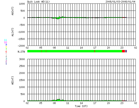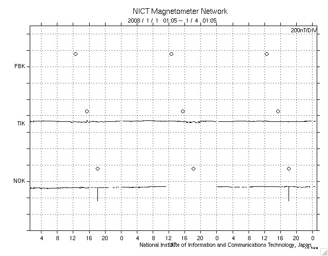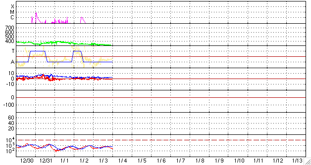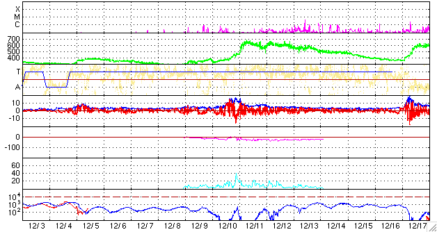 GOES衛星の太陽X線データ (c) NOAA/SWPC ![]() SOHO衛星のMDIカメラによる太陽黒点 (c) SOHO (ESA & NASA) ![]() ACEが観測した太陽風の磁場(1番上の枠、白線は全体の強度、赤線は南北成分) および、太陽風の密度(3番目の橙線)、速度(4番目の黄線) (c) NOAA/SWPC ![]() リアルタイムAE指数 下段のAEグラフの値が高くなると、オーロラ活動が活発化しています。 (c) 京都大学, NICT ![]() シベリアで観測された3日間の磁場データ 右側の3分の1が、昨日のデータになります。グラフが上がったり下がったりすると、オーロラ活動が活発化しています。 (c) NICT ![]() 27日の太陽周期に合わせたデータプロット 太陽が同じ面を地球に向けていた27日前の変化から、今後を予想することができます。 (c) NICT