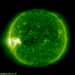 2008/ 1/ 4 10:06 更新 太陽風は一段と低速になり、磁気圏も穏やかです。コロナホールが太陽の中心に達しています。 担当 篠原 2日の夕方に、長時間型のC1フレアを起こした980黒点群ですが、 その後、活動は穏やかになっています。 X線の強度はだいぶ下がってきましたし、 可視光写真でも、黒点の姿はほとんど見えなくなっています。 むしろ、白斑の白い筋が目立っています。 もう、それほど大きなフレアを起こすことはなさそうです。 そして、SOHO EIT195の写真で、 980黒点群に続いて太陽の東端に見えている明るい領域ですが、 STEREOで先回りして見てみると、規模はより小さいものでした。 ここには、黒点は見られないのではないでしょうか。 太陽風は、かなり低速の状態になっています。 速度は一段と低下して、300km/秒を切ったところです。 磁場強度は2nTまで弱まっています。 磁気圏はとても穏やかで、AE指数、シベリアともに、全く変化が見られません。 今日、明日は、このまま静かに過ぎて行くでしょう。 SOHO EIT195によると、コロナホールがいよいよ太陽の中心線に達した様です。 これから、約3日後に高速の太陽風が地球へやって来ると考えられます。 日本時間で、7日の始めくらいでしょうか。 27日周期の図で前回を振り返ると、 この時は、高速風の1日ほど前から(12月10日)太陽風磁場の強まりが発生していました。 今回、これが繰り返されるかどうかはまだ分かりませんが、 その場合は、1月6日から太陽風の乱れが始まることになります。 SOHO衛星のEIT195カメラの映像 (c) SOHO (ESA & NASA)