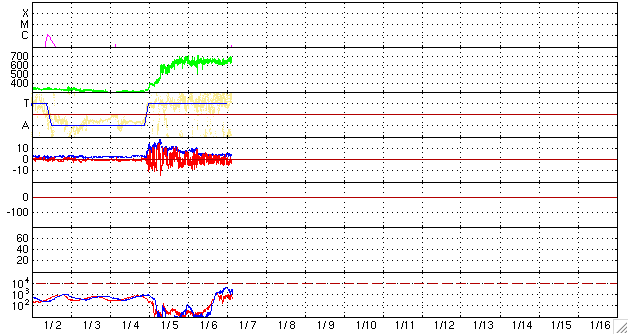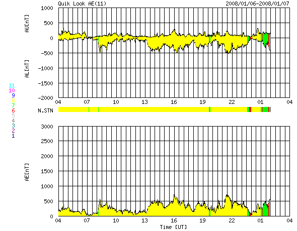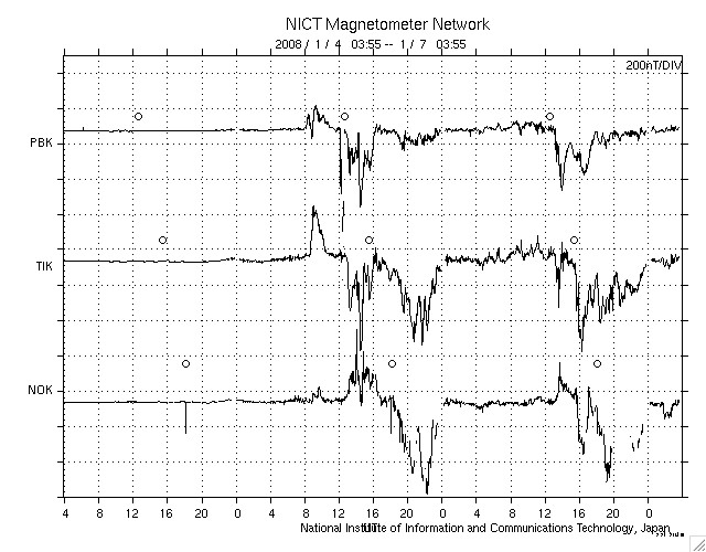 ACEが観測した太陽風の磁場(1番上の枠、白線は全体の強度、赤線は南北成分) および、太陽風の密度(3番目の橙線)、速度(4番目の黄線) (c) NOAA/SWPC ![]() リアルタイムAE指数 下段のAEグラフの値が高くなると、オーロラ活動が活発化しています。 (c) 京都大学, NICT ![]() シベリアで観測された3日間の磁場データ 右側の3分の1が、昨日のデータになります。グラフが上がったり下がったりすると、オーロラ活動が活発化しています。 (c) NICT ![]() 27日の太陽周期に合わせたデータプロット 太陽が同じ面を地球に向けていた27日前の変化から、今後を予想することができます。 (c) NICT