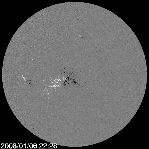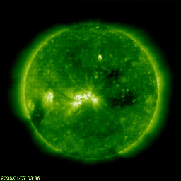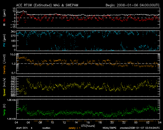 2008/ 1/ 7 12:55 更新 かなり速度の高い太陽風が続いています(640km/秒)。オーロラも活動的です。 担当 篠原 640km/秒のかなり速度の高い太陽風が続いています。 SOHO EIT195の太陽コロナの写真を見ると、 2つに分かれたコロナホールが、太陽の西半分の位置に見えています。 コロナホールの影響が地球によく届くタイミングです。 太陽風を詳しく見ると、磁場強度が10nTから5nTに弱まっています。 6日15時(世界時6日6時)頃のことで、 その後は、5nTでほとんど安定した状態になっています。 27日周期の図を見ると、この磁場強度の弱まりも、 前周期と比較して2日近く速くなっています。 今後の高速風の動きですが、全体がそのまま早まっているとすると、 明日くらいから速度の低下が始まるかもしれません。 ただ、コロナホールの位置では、もう少し高速状態が続きそうにも見えます。 この後、どのように変化して行くでしょうか。 太陽風の磁場強度が更に弱まって、3nTくらいになると、高速風は終盤に入ります。 この変化が、速度低下のひとつの目安になります。 太陽風の速度が高い上に、 磁場の南北成分(赤線)が、振幅は小さいですが南寄り(マイナス側)で変化しています。 このため、磁気圏にエネルギーが流れ込み、活発なオーロラ活動を作っています。 AE指数では、500nTくらいの中規模変動が、ほとんど1日を通して発生しています。 オーロラが、極北の空を彩っていたのでしょう。 シベリア磁場データを見ると、この2日間の活動の活発さがよく分かります。 このあとも、オーロラ活動は活発に続くでしょう。 やがて、太陽風の磁場強度が更に下がり、速度も下がり始めます。 それとともに、オーロラの規模、発生数も減少します。 もう2〜3日は十分に楽しめるのではないでしょうか。 高速太陽風がやって来ると、次は放射線帯の増加です。 高エネルギー電子は、増加を始めています。 今後、警戒レベルの10,000を超えることも考えられますので、しばらく注目してください。 太陽のフレア活動は、静穏です。 X線のグラフでは、ぎりぎりBクラスの小さな変化がひとつある程度です。 黒点は、981群がまだ残っているそうなのですが(太陽の中央の北緯30度付近)、 掲載の写真ではほとんど見つけられません。 参考に、磁場の写真も掲載します。 981黒点群は、中緯度側に発生した、新しい活動周期の黒点群です。 磁場の極性も、これまでの北半球型から反転しています。 (太陽の赤道付近に見える磁場構造は、南半球型の極性になっています) SOHOによる、可視光の太陽。北緯30度付近に981黒点群があるらしいが、ほとんど見えない。 (c) SOHO (ESA & NASA) ![]() SOHO衛星による太陽の磁場分布。上側の活動領域の極性は、新しい活動周期の向きになっている。 (c) SOHO (ESA & NASA) ![]() SOHO衛星のEIT195カメラの映像 (c) SOHO (ESA & NASA)