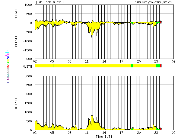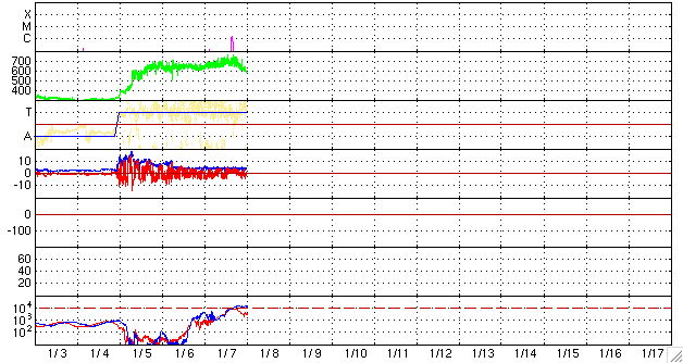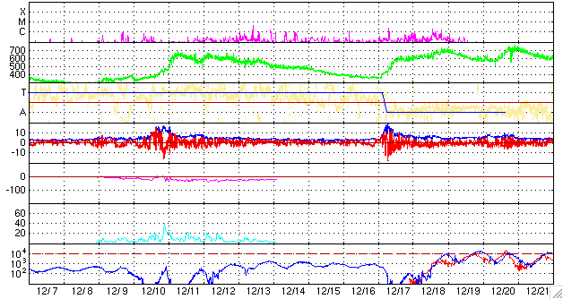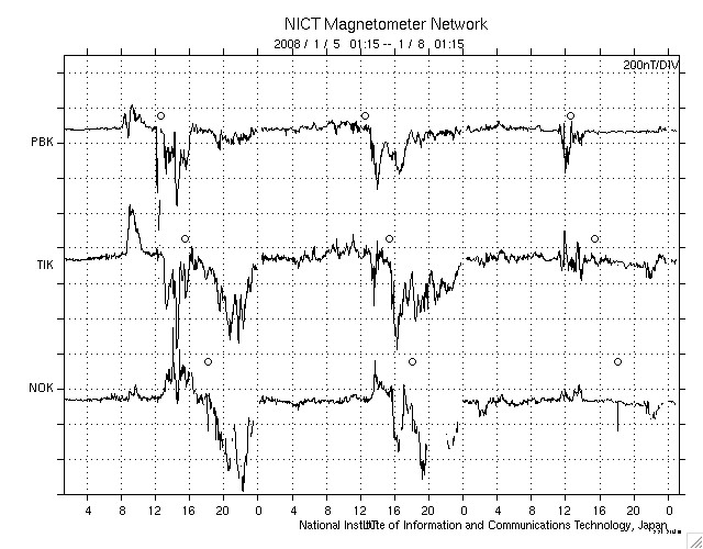 ACEが観測した太陽風の磁場(1番上の枠、白線は全体の強度、赤線は南北成分) および、太陽風の密度(3番目の橙線)、速度(4番目の黄線) (c) NOAA/SWPC ![]() リアルタイムAE指数 下段のAEグラフの値が高くなると、オーロラ活動が活発化しています。 (c) 京都大学, NICT ![]() シベリアで観測された3日間の磁場データ 右側の3分の1が、昨日のデータになります。グラフが上がったり下がったりすると、オーロラ活動が活発化しています。 (c) NICT ![]() 27日の太陽周期に合わせたデータプロット 太陽が同じ面を地球に向けていた27日前の変化から、今後を予想することができます。 (c) NICT