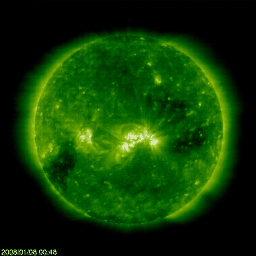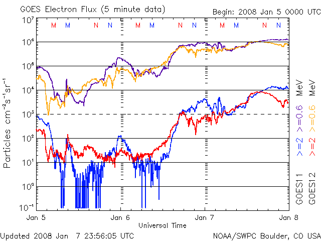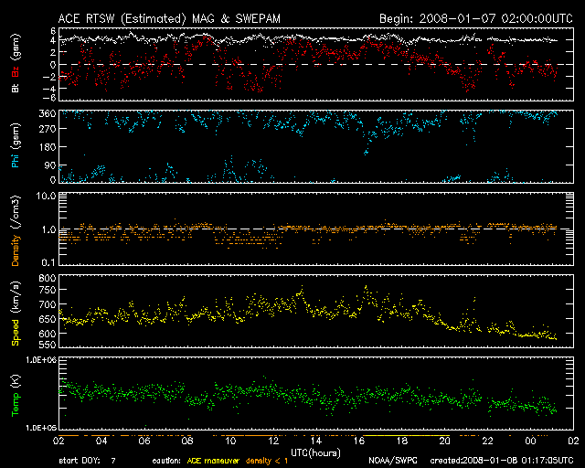 2008/ 1/ 8 10:18 更新 600km/秒台の高速太陽風が続いています。今後は下がる傾向です。放射線帯が強まっています。 担当 篠原 速度の高い太陽風が続いています。 昨日のニュースの後は更に高まり、650-700km/秒とかなり高い速度になりました。 この辺りが、今回の高速太陽風の最高速領域だった様です。 今朝になってやや速度は下がり、現在は600km/秒です。 今後は、次第に速度は下がって行く方向にあります。 SOHO EIT195では、コロナホールは太陽の西側にだいぶ移動しました。 この位置関係だと、高速風はまだ2日くらいは残りそうですが、どうなるでしょうか。 そして、この写真の南東(左下)には、次のコロナホールが姿を見せています。 こちらは、前周期、12月17日以降の高速風をもたらしました。 今回は、1月13日ころの到来が予想されます。 こちらは、もう少し姿がよく見えて来たところで検討しましょう。 とても速度の高い太陽風が続いていますが、磁気圏活動はやや弱まっています。 AE指数では、500nT規模の変動が前半に見えていますが、後半は静かになっています。 前半の変化も、昨日のグラフと比べると、やや控えめの様です。 この傾向は、シベリア磁場データを見てもはっきりしていて、 前半2日分の変化と比べて、昨日の変化は幅がずいぶん小さくなっています。 これは、太陽風の磁場の南向きの変化が、より小幅になっているためだと思います。 磁場強度が弱まって来ましたから、今後はオーロラ活動も小ぶりに限られるでしょう。 放射線帯高エネルギー電子が大きく上昇しています。 10,000の警戒レベルを超えました。 これは、更に上昇すると思われます。 衛星の運用などでは注意が必要な状態になっています。 太陽では、C1クラスの小さな小規模フレアが起こりました。 太陽中心付近の、980黒点群です。 (掲載の写真では黒点の姿は見えず、番号も書かれていませんが) X線のグラフで、その前に見えるB1の小さな変化は、981黒点群で起こっています。 しかし、太陽のフレア活動が活発化するということはないでしょう。 SOHO衛星のEIT195カメラの映像 (c) SOHO (ESA & NASA)