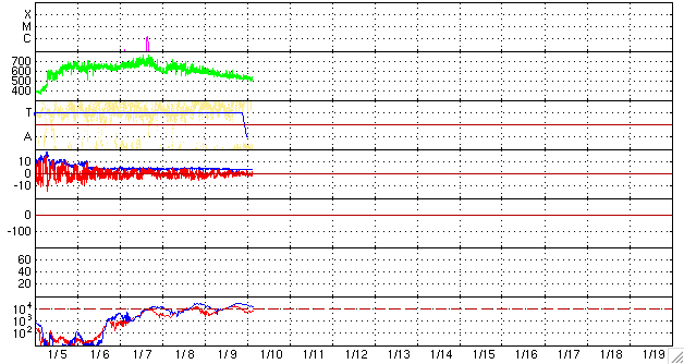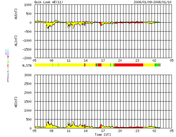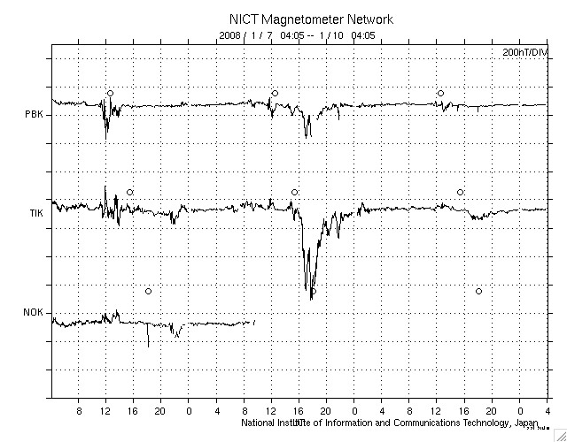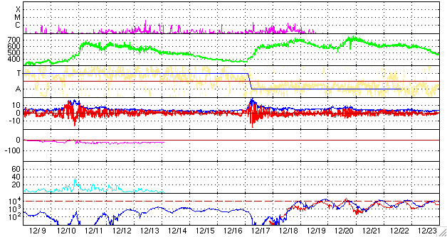 ACEが観測した太陽風の磁場(1番上の枠、白線は全体の強度、赤線は南北成分) および、太陽風の密度(3番目の橙線)、速度(4番目の黄線) (c) NOAA/SWPC ![]() リアルタイムAE指数 下段のAEグラフの値が高くなると、オーロラ活動が活発化しています。 (c) 京都大学, NICT ![]() シベリアで観測された3日間の磁場データ 右側の3分の1が、昨日のデータになります。グラフが上がったり下がったりすると、オーロラ活動が活発化しています。 (c) NICT ![]() 27日の太陽周期に合わせたデータプロット 太陽が同じ面を地球に向けていた27日前の変化から、今後を予想することができます。 (c) NICT