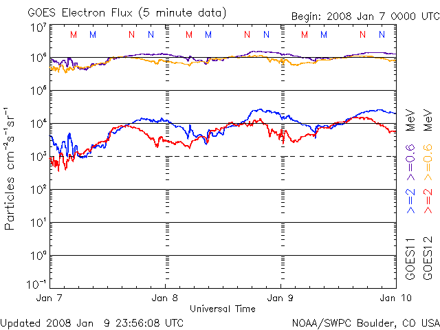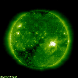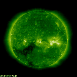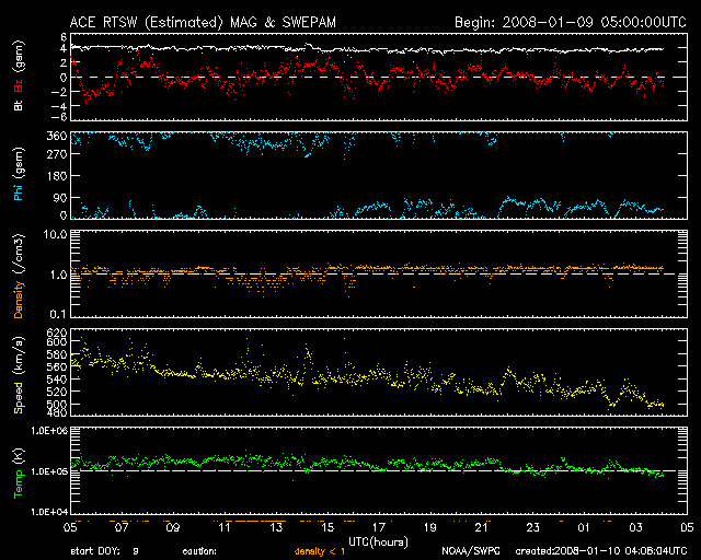 2008/ 1/10 13:06 更新 高速太陽風は終わりに近づいています(500km/秒)。一旦穏やかになって、また高速風がやって来ます。 担当 篠原 高速の太陽風が続いていますが、速度はだいぶ下がって来ました。 それとともに、磁気圏の活動も次第に穏やかになっています。 昨日のニュースの頃まで600km/秒台を保っていた高速太陽風ですが、 その後、じわじわと速度を下げて行き、現在500km/秒に下がっています。 今回の高速風領域は、終盤を迎えました。 27日周期の図を見てください。 昨日から今日にかけての太陽風速度の下がり具合は、前周期と良く似ています。 今後の変化も前回の様子が参考になりそうです。 太陽風の速度が下がって、オーロラの活動も落ちついています。 オーロラの活動度を示すAE指数には、300nT程度の小規模の変化が見られるだけです。 また、シベリア磁場データの変化も、昨日(右側の3分の1)は一気に小さくなっています。 今日、明日と太陽風は静穏状態に向かいます。 それとともに、磁気圏は更に静かになっていくでしょう。 そして、3日後の1月13日くらいから、次の高速太陽風がやって来ます。 発生源であるコロナホールが、太陽の中心部に到達しました。 SOHO EIT195の左の写真を見てください(こちらは現在の太陽コロナです)。 太陽の南東(左下)の端から、 中心に向かって切り込む様に、コロナホールの黒い影が伸びています。 その先頭部分(右端)の位置に注目してください。 ここが、太陽の中心に到着すると、 3日後くらいから地球に速度の高い風がやって来るのです。 EIT195の右の写真は、27日前(太陽の自転周期)の太陽コロナです。 現在の様子(左の写真)と比較すると、 コロナホールの形は多少変化していますが、場所は大きく変わってはいません。 ですので、今後の高速太陽風の変化は、前周期と似たものになりそうです。 13日以降は、活発なオーロラ活動も期待できます。 オーロラライブカメラにも注目してください。 高速風が続き、放射線帯の高エネルギー電子は10,000を超えるレベルを保っています。 このまま次の高速風まで警戒状態が続くでしょう。 太陽は無黒点になりました。 X線のグラフも静かです。 SOHO衛星のEIT195カメラの映像 (c) SOHO (ESA & NASA)