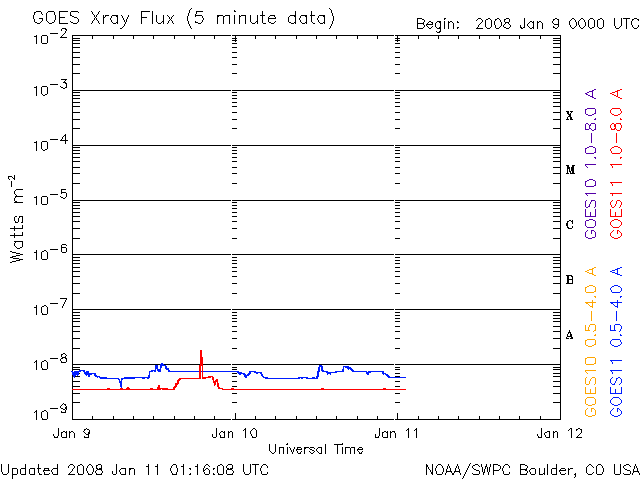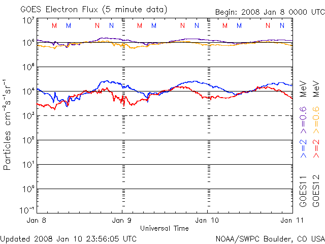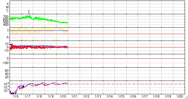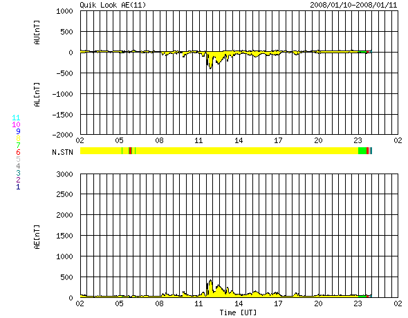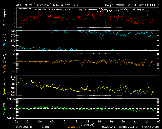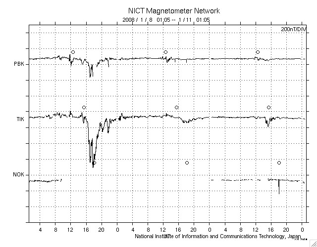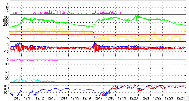 ACEが観測した太陽風の磁場(1番上の枠、白線は全体の強度、赤線は南北成分) および、太陽風の密度(3番目の橙線)、速度(4番目の黄線) (c) NOAA/SWPC ![]() リアルタイムAE指数 下段のAEグラフの値が高くなると、オーロラ活動が活発化しています。 (c) 京都大学, NICT ![]() シベリアで観測された3日間の磁場データ 右側の3分の1が、昨日のデータになります。グラフが上がったり下がったりすると、オーロラ活動が活発化しています。 (c) NICT ![]() GOES衛星による、静止衛星軌道における高エネルギー電子の変化 (c) NOAA/SWPC ![]() SOHO衛星のMDIカメラによる太陽黒点 (c) SOHO (ESA & NASA) ![]() GOES衛星の太陽X線データ (c) NOAA/SWPC ![]() 2008/ 1/11 10:23 追加 27日の太陽周期に合わせたデータプロット 太陽が同じ面を地球に向けていた27日前の変化から、今後を予想することができます。 (c) NICT