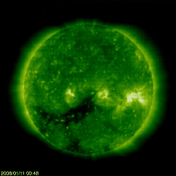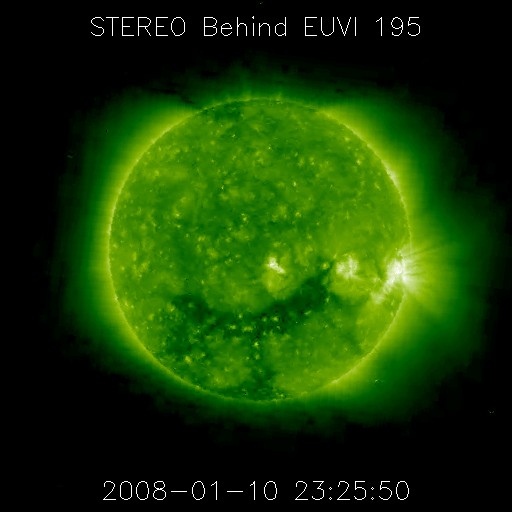 2008/ 1/11 10:18 更新 太陽風は通常の状態に戻り、磁気圏も穏やかです。大きなコロナホールが見えています。 2008/ 1/11 10:23 追加 27日周期の図が未掲載でした。 担当 篠原 今日は、STEREO衛星で、コロナホールの様子を先回りして見てみましょう。 1枚めに掲載しているのは、STEREO Behindという、 地球よりも少し遅れて太陽を公転している人工衛星が撮影した太陽です。 地球よりも1日半ほど先回りして、太陽の姿を見ることができます。 次に掲載しているのは、いつもの、SOHO EIT195の最新写真です。 コロナホールの形を見比べると、STEREOが先回りしている様子がよく分かります。 STEREOの写真によると、現在太陽に見えているコロナホールは、 南半球に少し上がった位置に、東西に太く長く広がっています。 このため、ここから吹き出す高速の太陽風は、かなり長い期間続くことが予想されます。 1週間くらいは十分続きそうです。 前周期も、この高速風は12月17日から1週間続きました。 このまま対応させると、1月13日から19日まで600km/秒前後の速い風が吹くことが予想されます。 前周期のこの期間はオーロラ活動も活発で、今回も期待したいところです。 高速風の立ち上がりの頃に、最も激しい活動が見られるので、 13日は、オーロラライブカメラにも注目してください。 さて、現在の太陽風は、速度が450km/秒に下がり、通常の状態にほぼ戻っています。 磁気圏活動も静かになっていて、AE指数に小さな変化がひとつ見えている程度です。 今日と明日は、このまま穏やかに過ぎて行くでしょう。 そして、高速太陽風がやって来ます。 放射線帯高エネルギー電子は、高いレベルを保っています。 10,000の警戒レベルを楽に超えていて、明後日までは注意が必要です。 太陽はとても静穏です。 中心から少し東(左)の場所に、黒点がひとつ見えています。 982黒点群となりそうです。 2008/ 1/11 10:23 追加 (篠原) 関連の図はページの最後にあります STEREO衛星極紫外線望遠鏡EUVI195で先回りして見た太陽コロナ。11日8時半(世界時10日23時半) (c) NASA ![]() SOHO衛星のEIT195カメラの映像 (c) SOHO (ESA & NASA)