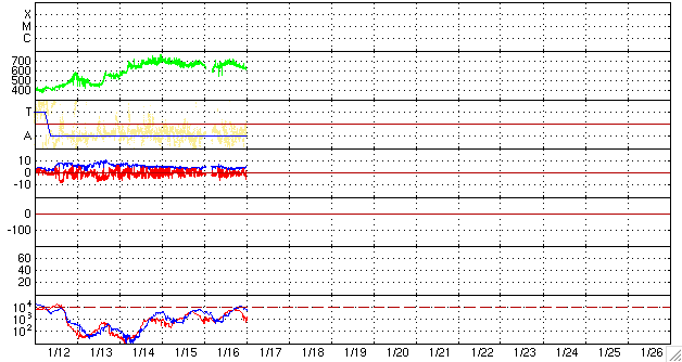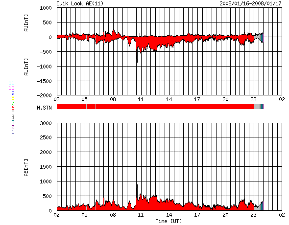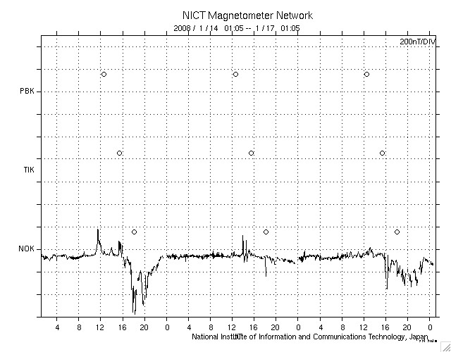 ACEが観測した太陽風の磁場(1番上の枠、白線は全体の強度、赤線は南北成分) および、太陽風の密度(3番目の橙線)、速度(4番目の黄線) (c) NOAA/SWPC ![]() リアルタイムAE指数 下段のAEグラフの値が高くなると、オーロラ活動が活発化しています。 (c) 京都大学, NICT ![]() シベリアで観測された3日間の磁場データ 右側の3分の1が、昨日のデータになります。グラフが上がったり下がったりすると、オーロラ活動が活発化しています。 (c) NICT ![]() 27日の太陽周期に合わせたデータプロット 太陽が同じ面を地球に向けていた27日前の変化から、今後を予想することができます。 (c) NICT