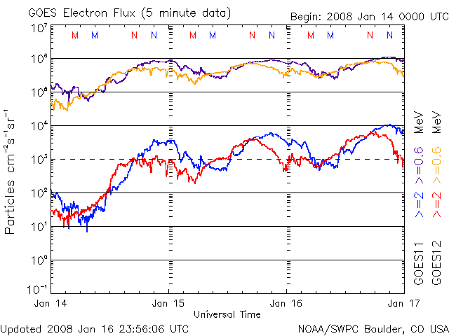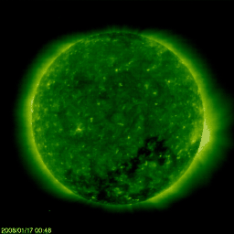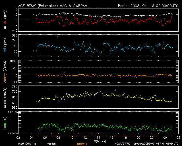 2008/ 1/17 10:06 更新 600km/秒台の高速太陽風が続いています。オーロラの活動は次第に弱まっています。 担当 篠原 1月4日に現れた新しい太陽周期の黒点について、SOHOの写真をまとめました。 どうぞご覧下さい。 Happy New Solar Cycle !! 昨日のニュース以降も、太陽風の速度は600〜700km/秒を保っていました。 コロナホール起源の高速風としては、高い速度が続いています。 昨日、一旦600km/秒近くにまで下がりましたが、 盛り返して700km/秒近くまで上がるなど、なかなかがんばっています。 今朝に入って再び下がり、現在は、600km/秒近くに落ちています。 27日周期の図を参考にすると、明後日くらいまでは高めの速度が続きそうで、 まだまだ簡単には低下しないのではないかと思われます。 今日の太陽風の変化にも注目したいところです。 磁気圏のオーロラ活動は、だんだん規模が小さくなっています。 AE指数のグラフでは、500nTの活動が一度だけになり、 その他は300nTくらいの小規模変動ばかりです。 それでも、連続的に発生していますから、 北極のオーロラは、なかなかにぎやかだったのではないでしょうか。 高速太陽風はもうしばらく続くと思いますが、 終盤に近づくにつれて、磁場強度が弱まって行きます。 すると、磁場の南向き成分も弱まるので、磁気圏の活動は一段と小さくなります。 オーロラ観望としては、これから日を追うごとに期待度が下がります。 そして、20日くらいに太陽風は通常の状態にもどり、 2週間にわたる、長い静穏な期間が始まります。 放射線帯の高エネルギー電子は、ちょうど10,000に達したところです。 警戒レベルには達しましたが、この後、大きく増加することはないでしょう。 太陽は無黒点で、静穏です。 新しい周期は始まりましたが、黒点が増えるのはまだ先のことの様です。 SOHO衛星のEIT195カメラの映像 (c) SOHO (ESA & NASA)