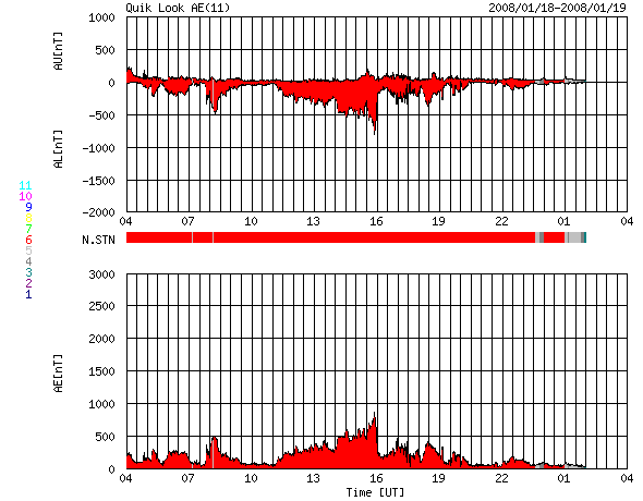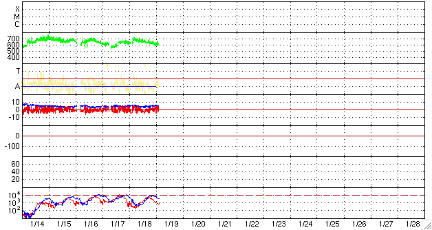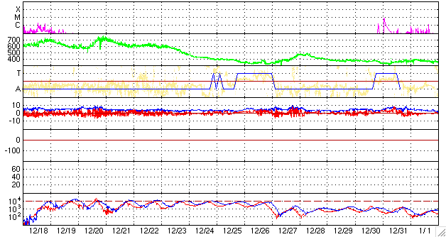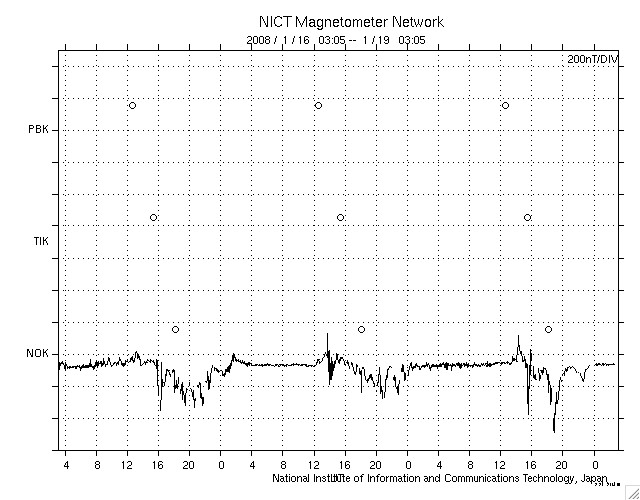 ACEが観測した太陽風の磁場(1番上の枠、白線は全体の強度、赤線は南北成分) および、太陽風の密度(3番目の橙線)、速度(4番目の黄線) (c) NOAA/SWPC ![]() リアルタイムAE指数 下段のAEグラフの値が高くなると、オーロラ活動が活発化しています。 (c) 京都大学, NICT ![]() シベリアで観測された3日間の磁場データ 右側の3分の1が、昨日のデータになります。グラフが上がったり下がったりすると、オーロラ活動が活発化しています。 (c) NICT ![]() 27日の太陽周期に合わせたデータプロット 太陽が同じ面を地球に向けていた27日前の変化から、今後を予想することができます。 (c) NICT