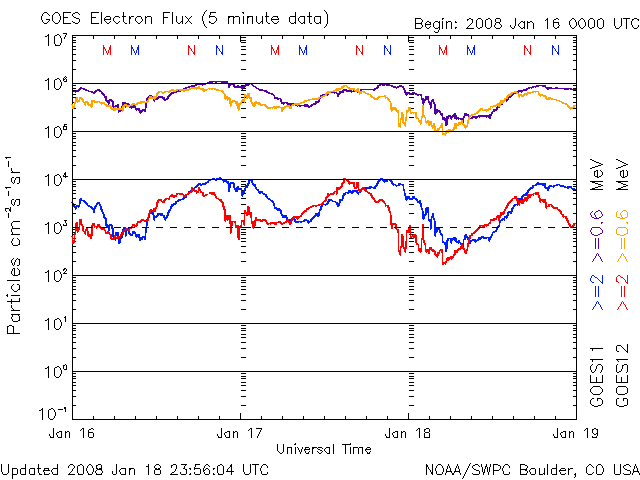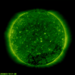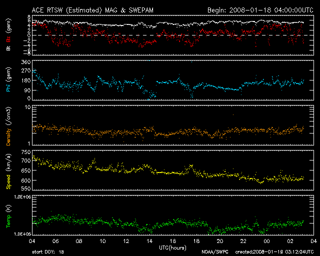 2008/ 1/19 12:06 更新 太陽風は、600km/秒台の高い速度を保っています。オーロラも活発です。 担当 篠原 27日周期の図を見てください。 今回の高速太陽風は、1月13日に始まり(掲載の図では切れています)、 今日で7日めを迎えています。 前周期の変化を振り返ると、12月17日から23日にかけて高速風が発生しました。 タイミングを比較すると、27日の周期性にきれいに一致して高速風が続いています。 終わりの変化も一致すると考えると、今日くらいから高速風は低下に向かいそうです。 現在の太陽風は、速度が600km/秒で、まだかなり高い速度を保っています。 昨日も、ニュースの後に再び700km/秒まで上がるという、元気な様子を見せていて、 コロナホールの後半の濃かった部分からの影響だったのではないかと思います。 それでも、SOHO EIT195の太陽写真で、コロナホールを見ると、 低緯度側のコロナホールは、かなり西の方へ去りました。 地球への影響はそろそろ弱まりそうです。 コロナホールは、南極側へも濃く広がっていますが、 こちらは緯度が高いので、地球への影響は弱まります。 この点も、このあとの太陽風の変化で興味が持たれるところです。 磁気圏のオーロラ活動は、少し活動を強めていました。 AE指数では、500〜700nTくらいの中規模活動が観測され、 シベリア磁場データでも、一昨日(中央)よりも一段活発な変化が、 昨日(右側)のところで記録されています。 この1週間は、オーロラもなかなか活発に続きました。 この後、太陽風が弱まって行くとすると、 このにぎやかさも今日あたりまでとなるでしょう。 明日からは、次第に静かになって行くと思います。 放射線帯の高エネルギー電子は、減少を始めています。 既に、10,000のレベルを割り、警戒レベルからは下がっています。 この後も、ゆっくりと下がって行くでしょう。 太陽はとても穏やかです。 黒点はありません。 SOHO衛星のEIT195カメラの映像 (c) SOHO (ESA & NASA)