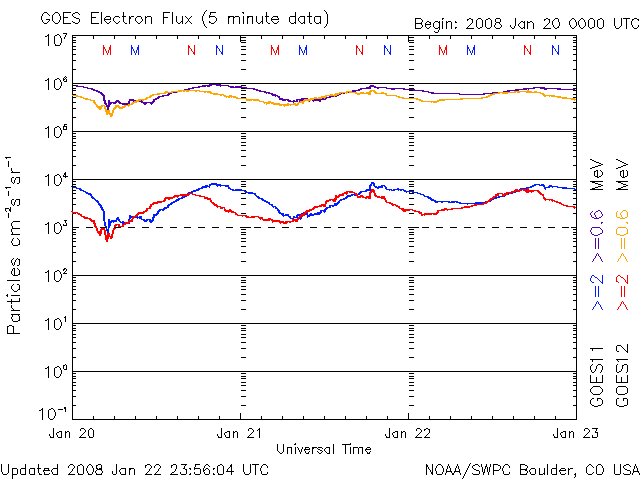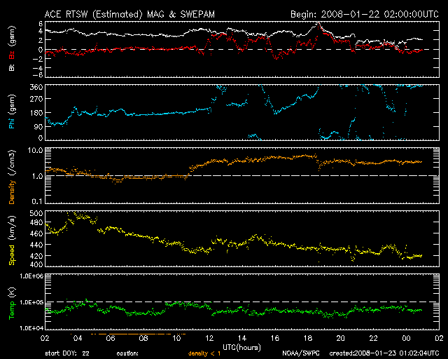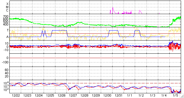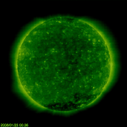 2008/ 1/23 10:02 更新 太陽風は普通の速度に戻りました。磁気圏はとても穏やかです。 担当 篠原 太陽風の速度(ACEの黄色線)は420km/秒に下がり、普通の風に戻りました。 磁場強度(白線)も4nTから2nTへ弱まり、 南北成分は0nTから北側で推移しています。 このため、磁気圏はかなり穏やかになっています。 AE指数は気持ちよいくらい真っ平らで、ほとんど何も起こらなかった様です。 (データが完全に揃っていないためかもしれません) シベリア磁場データも、昨日の変化(右側3分の1)は、何もなしです。 これから今月いっぱい、1月31日までは、基本的に穏やかな状態が続くでしょう。 27日周期の図で、前回の変化を見てください。 次の擾乱は、1月5日に始まった高速風の回帰です。 それまでに、小さな変動が2つほど見られますが、 SOHO EIT195を見ても、コロナホールの姿は特に見られないので、 今回も目立った乱れはやって来ないでしょう。 放射線帯の高エネルギー電子は、ほとんど変化がありません。 やや高めのレベルが続いています。 減少はゆっくり進みます。 太陽は黒点も無く、とても穏やかです。 SOHO衛星のEIT195カメラの映像 (c) SOHO (ESA & NASA)