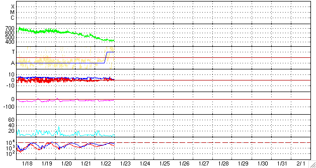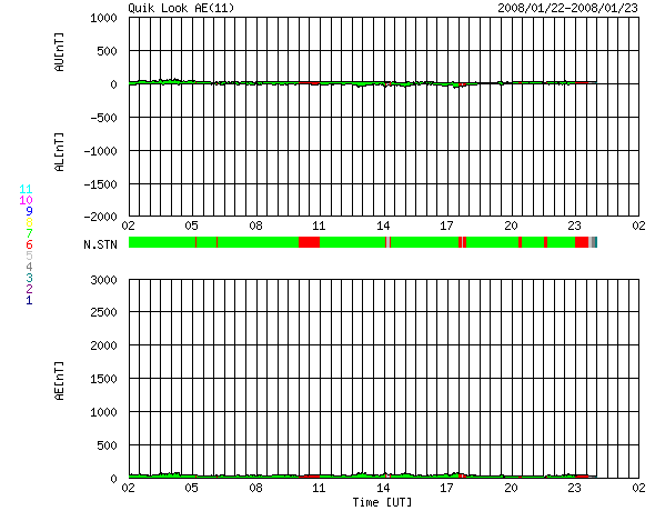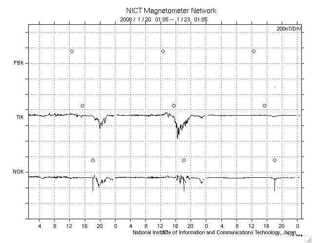 ACEが観測した太陽風の磁場(1番上の枠、白線は全体の強度、赤線は南北成分) および、太陽風の密度(3番目の橙線)、速度(4番目の黄線) (c) NOAA/SWPC ![]() リアルタイムAE指数 下段のAEグラフの値が高くなると、オーロラ活動が活発化しています。 (c) 京都大学, NICT ![]() シベリアで観測された3日間の磁場データ 右側の3分の1が、昨日のデータになります。グラフが上がったり下がったりすると、オーロラ活動が活発化しています。 (c) NICT ![]() 27日の太陽周期に合わせたデータプロット 太陽が同じ面を地球に向けていた27日前の変化から、今後を予想することができます。 (c) NICT
