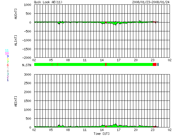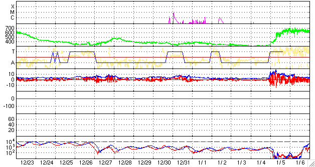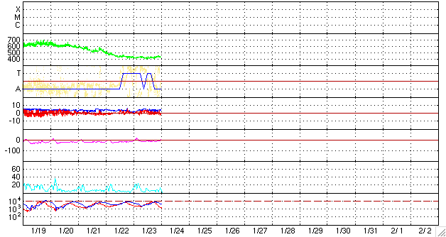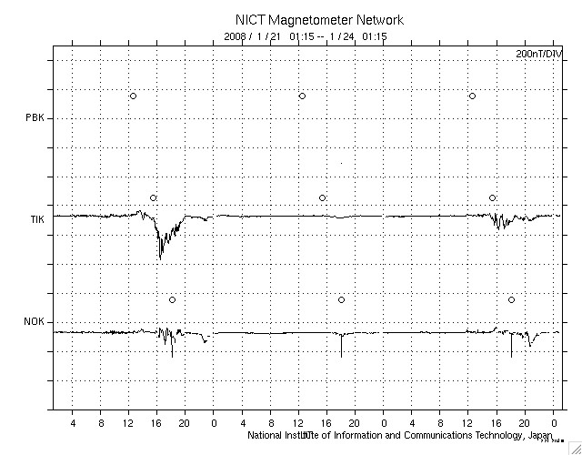 ACEが観測した太陽風の磁場(1番上の枠、白線は全体の強度、赤線は南北成分) および、太陽風の密度(3番目の橙線)、速度(4番目の黄線) (c) NOAA/SWPC ![]() リアルタイムAE指数 下段のAEグラフの値が高くなると、オーロラ活動が活発化しています。 (c) 京都大学, NICT ![]() シベリアで観測された3日間の磁場データ 右側の3分の1が、昨日のデータになります。グラフが上がったり下がったりすると、オーロラ活動が活発化しています。 (c) NICT ![]() 27日の太陽周期に合わせたデータプロット 太陽が同じ面を地球に向けていた27日前の変化から、今後を予想することができます。 (c) NICT
