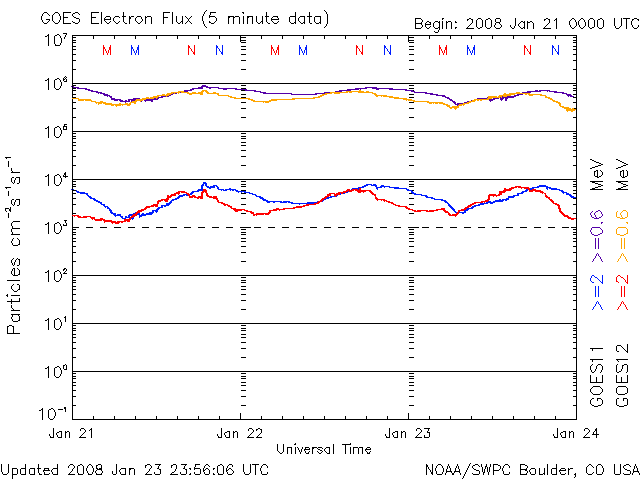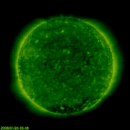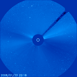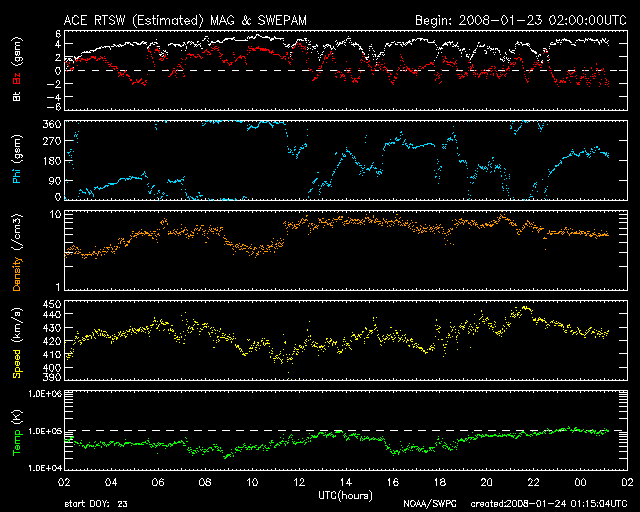 2008/ 1/24 10:16 更新 穏やかな太陽風、磁気圏です。小規模のCMEが起こっています。 担当 篠原 太陽でゆっくりとしたCME(太陽ガスの放出現象)が見られています。 SOHO LASCO C3の動画を掲載します。 太陽の南側(下)に向かって、白いガスが吹き出しています。 太陽の反対側で発生した現象だろうと見られています。 地球への影響はありません。 高速風領域を抜け出して、太陽風は落ち着いています。 速度は430km/秒、磁場強度は4nTと、どちらも普通の状態です。 この期間は、前周期に小さな乱れが見られたのですが、 今のところ、それに対応する変化は見られません。 磁気圏も静かな状態で、 シベリア磁場データに小さな変動がいくらか見えている程度です。 今日、明日と、現在の様な状態が続き、 その後、太陽風は400km/秒を割って、低速風へ移行するのではないかと予想されます。 月末まで、静かな宇宙天気が続きます。 放射線帯の高エネルギー電子は、目立った変化は見られません。 まだやや高めのレベルにありますが、ゆっくりと減少する方向です。 太陽には黒点は見られず、全く静穏です。 東側から黒点が上がって来る気配も見られません。 SOHO LASCO C3カメラによる、1月23日のCME。南に向かってゆっくり飛び出しています。 (c) SOHO (ESA & NASA) ![]() SOHO衛星のEIT195カメラの映像 (c) SOHO (ESA & NASA)