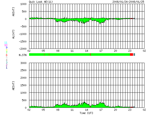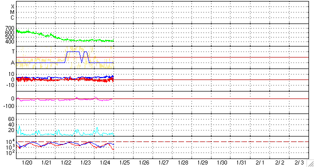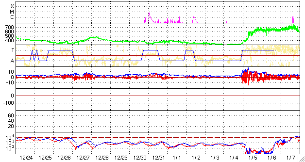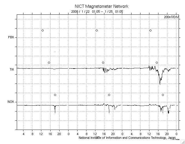 ACEが観測した太陽風の磁場(1番上の枠、白線は全体の強度、赤線は南北成分) および、太陽風の密度(3番目の橙線)、速度(4番目の黄線) (c) NOAA/SWPC ![]() リアルタイムAE指数 下段のAEグラフの値が高くなると、オーロラ活動が活発化しています。 (c) 京都大学, NICT ![]() シベリアで観測された3日間の磁場データ 右側の3分の1が、昨日のデータになります。グラフが上がったり下がったりすると、オーロラ活動が活発化しています。 (c) NICT ![]() 27日の太陽周期に合わせたデータプロット 太陽が同じ面を地球に向けていた27日前の変化から、今後を予想することができます。 (c) NICT