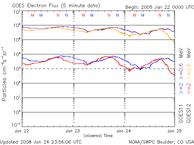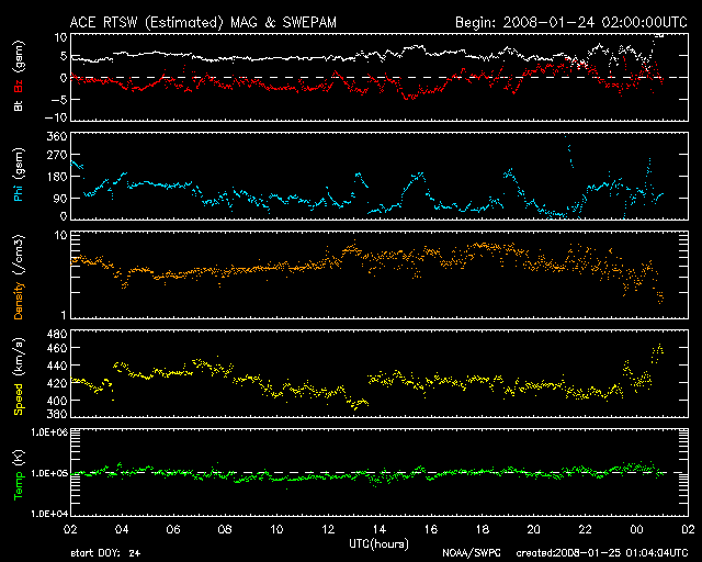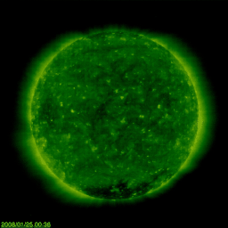 2008/ 1/25 10:05 更新 穏やかな太陽風ですが、南向き磁場の影響で、小規模の磁気圏活動が起こっています。 担当 篠原 比較的穏やかな宇宙天気が続いています。 太陽風は、速度420km/秒、磁場強度5nTと通常の状態を保っています。 磁場の南北成分が弱い南寄りになっていて、 -2nT前後の状態が長い時間続いています。 そのためでしょう、AE指数でも、200〜300nTの弱い変化が長く見られています。 小規模のオーロラが見られていたのかもしれません。 まだ1週間くらい、太陽風、磁気圏は基本的に穏やかな状態が続きます。 SOHO EIT195には、高速太陽風の発生源となるコロナホールは見られません。 もう数日すると、次のコロナホールが姿を見せるでしょう。 小さな磁気圏活動の影響でしょうか、放射線帯の高エネルギー電子は、 減少のスピードをやや速めています。 10,000のラインからはだいぶ離れて来ました。 太陽はとても穏やかです。 SOHO衛星のEIT195カメラの映像 (c) SOHO (ESA & NASA)