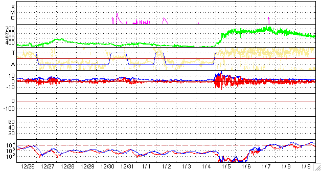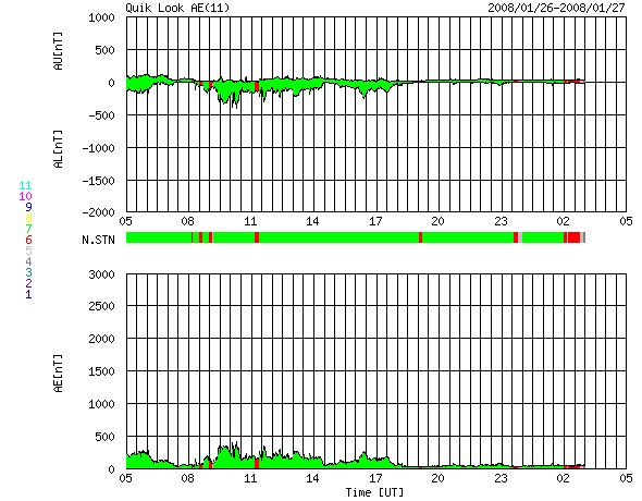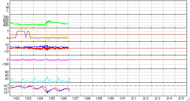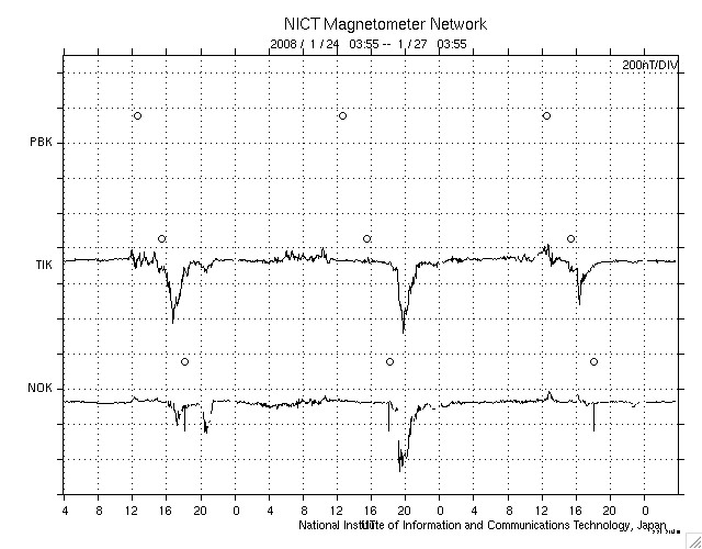 ACEが観測した太陽風の磁場(1番上の枠、白線は全体の強度、赤線は南北成分) および、太陽風の密度(3番目の橙線)、速度(4番目の黄線) (c) NOAA/SWPC ![]() リアルタイムAE指数 下段のAEグラフの値が高くなると、オーロラ活動が活発化しています。 (c) 京都大学, NICT ![]() シベリアで観測された3日間の磁場データ 右側の3分の1が、昨日のデータになります。グラフが上がったり下がったりすると、オーロラ活動が活発化しています。 (c) NICT ![]() 27日の太陽周期に合わせたデータプロット 太陽が同じ面を地球に向けていた27日前の変化から、今後を予想することができます。 (c) NICT