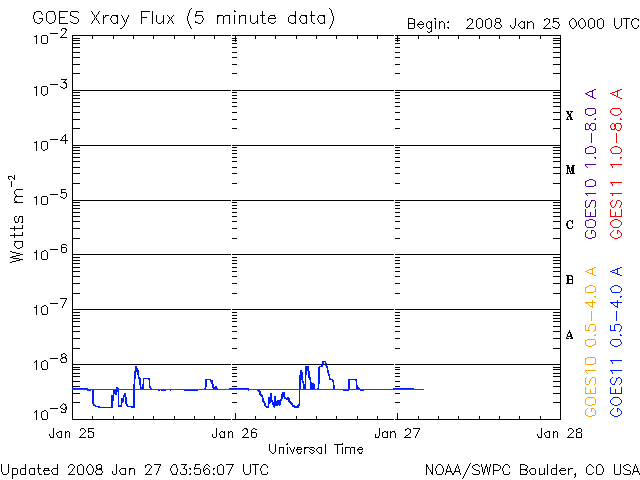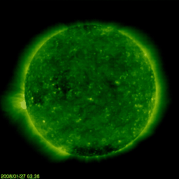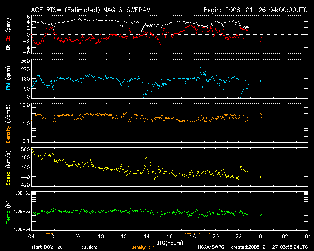 2008/ 1/27 12:57 更新 太陽風は、通常の状態に戻りつつあります。磁気圏も穏やかです。 担当 篠原 太陽風の速度はゆっくりと下がり、現在、440km/秒です。 太陽風は、通常の状態に戻りつつあります。 27日周期の図で、太陽風速度の変化を数日の幅で見ると、 今回の乱れは、前周期よりもはっきりした速度の盛り上がりになっています。 今後、更に大きくなっていくのでしょうか。 磁気圏は、AE指数で300nTほどの小さな乱れが続いていましたが、 速度の低下とともに見られなくなり、静穏になっています。 今後も、静かに過ぎて行くでしょう。 SOHO EIT195では、太陽の中心から少し左のとろこに、 コロナホールの影が見えています。 大きさはそれほど大きくありませんが、 2月1日からやって来る、次の高速風の発生源にあたると思われます。 明日、太陽の中心線に達すると見ると、高速風の回帰が少し早まるのかもしれません。 太陽は黒点は見られず、とても静穏です。 SOHO衛星のEIT195カメラの映像 (c) SOHO (ESA & NASA)