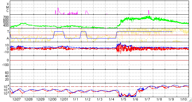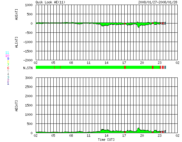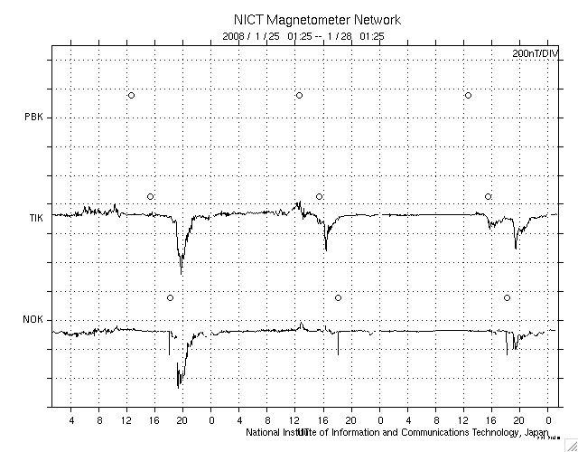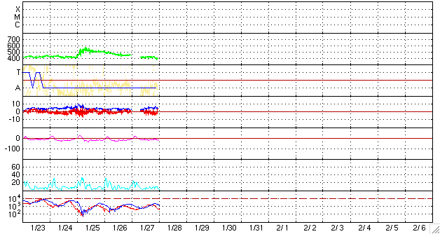 ACEが観測した太陽風の磁場(1番上の枠、白線は全体の強度、赤線は南北成分) および、太陽風の密度(3番目の橙線)、速度(4番目の黄線) (c) NOAA/SWPC ![]() リアルタイムAE指数 下段のAEグラフの値が高くなると、オーロラ活動が活発化しています。 (c) 京都大学, NICT ![]() シベリアで観測された3日間の磁場データ 右側の3分の1が、昨日のデータになります。グラフが上がったり下がったりすると、オーロラ活動が活発化しています。 (c) NICT ![]() 27日の太陽周期に合わせたデータプロット 太陽が同じ面を地球に向けていた27日前の変化から、今後を予想することができます。 (c) NICT