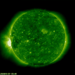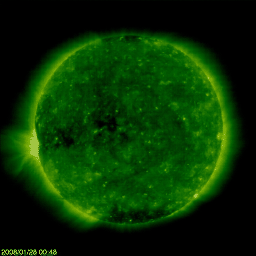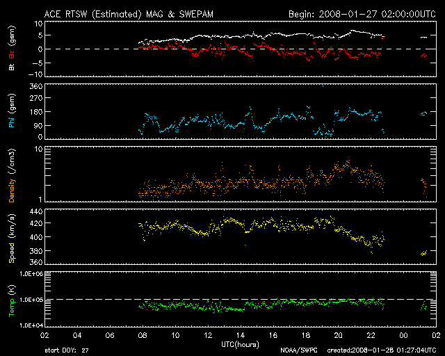 2008/ 1/28 10:28 更新 太陽風は400km/秒で、穏やかです。小さな磁気圏活動が見られています。 担当 篠原 太陽風の速度は400km/秒前後に下がり、穏やかな風になっています。 磁場強度も5nTと、普通のレベルです。 磁場の南北成分が弱い南寄りになっていて、 弱いオーロラ活動を連続的に起こしている様です。 AE指数で、100〜200nTくらいの小さな変化が半日ほど続いています。 磁場南寄りの傾向が続く間、現在の様な小規模活動が見られるでしょう。 太陽風は普通の状態にあるので、磁気圏は基本的には穏やかな状態を保つでしょう。 SOHO EIT195の太陽コロナ写真を見ると、 コロナホールが太陽の中心線に達しつつあります。 赤道に沿って、東端(左端)から中心付近まで淡い影が見えています。 コロナホールとしては、淡いほうだと思いますが、 27日前のEIT195の写真(ちょうどお正月です)と比較すると、 これでも前回より濃くなっています。 コロナホールが太陽の中心に達すると、3日後くらいから太陽風の速度が上昇します。 今日から3日後だと考えると、1月31日になります。 一方、27日周期の図で前回の高速風の回帰を予想すると、2月1日です。 どちらに近い結果となるでしょうか。 回帰が1日程度前後することは普通にありますし、 コロナホールの見え方が変化していることもあるので、 31日以降の変化に注目してください。 太陽は無黒点のままです。 黒点写真に980黒点群の数字が出ていますが、これは前周期の情報が残っているためです。 980黒点群がまだ残っていれば、この辺りに見えるはずです。 SOHOの現在の写真では、黒点は見えていません。 SOHO衛星のEIT195カメラの映像 (c) SOHO (ESA & NASA)