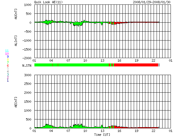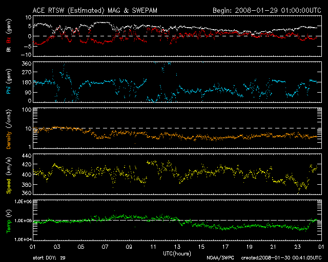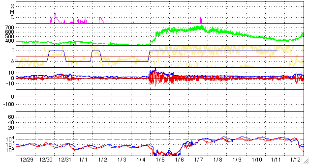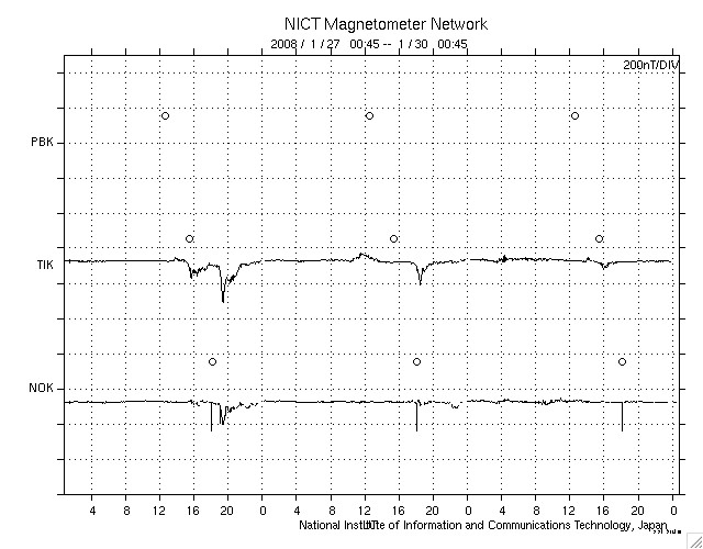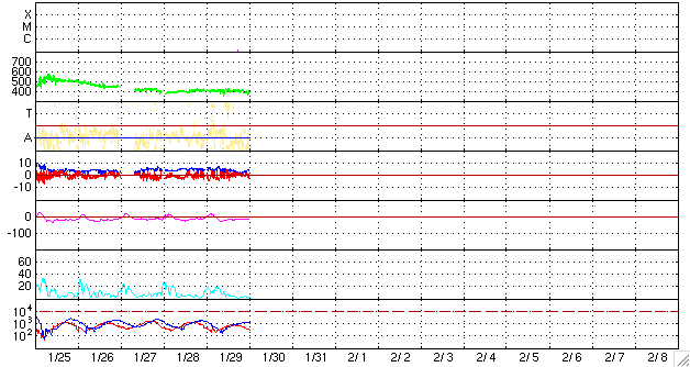 GOES衛星の太陽X線データ (c) NOAA/SWPC ![]() ACEが観測した太陽風の磁場(1番上の枠、白線は全体の強度、赤線は南北成分) および、太陽風の密度(3番目の橙線)、速度(4番目の黄線) (c) NOAA/SWPC ![]() リアルタイムAE指数 下段のAEグラフの値が高くなると、オーロラ活動が活発化しています。 (c) 京都大学, NICT ![]() シベリアで観測された3日間の磁場データ 右側の3分の1が、昨日のデータになります。グラフが上がったり下がったりすると、オーロラ活動が活発化しています。 (c) NICT ![]() 27日の太陽周期に合わせたデータプロット 太陽が同じ面を地球に向けていた27日前の変化から、今後を予想することができます。 (c) NICT