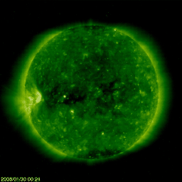 2008/ 1/30 09:45 更新 穏やかな太陽風が続いています。小さな黒点が出現しました。 担当 篠原 太陽に久しぶりに黒点が出現しています。 前周期に980黒点群があったところで、昨日は磁場の強まりと白斑だけが見えていたのですが、 SOHOの最新の写真では、小さな黒点が姿を現しています。 982黒点群という番号が付いています。 規模は小さく、太陽は穏やかなままでしょう。 速度400km/秒の穏やかな太陽風が続いています。 プラズマ密度の増加が見られていましたが、特にどうという変化もなく、 穏やかな状態が続いています。 このまま、次の高速風へつながって行きそうです。 SOHO EIT195では、コロナホールが太陽の中心を東西に大きく横切っています。 高速風の到来が、近づいています。 磁気圏も穏やかです。 小さなオーロラ活動がAE指数で記録されていますが、全体的には静穏です。 ただ、昨日、アラスカのライブカメラを見ていて、 突発的にとても明るいオーロラの輝きを見ることができました。 全体像を示すAE指数では小さな活動でも、 見る場所が一致すれば、とてもきれいな光を見ることができます。 明日か、明後日以降、活発なオーロラが期待できます。 シーズンも後半ですし、空いた時間にライブカメラをながめてみてはいかがでしょうか。 SOHO MDIカメラによる、30日7時半(世界時29日22時半)の太陽。東の端近くに、小さな黒点が見えています。 (c) ESA & NASA ![]() SOHO衛星のEIT195カメラの映像 (c) SOHO (ESA & NASA)