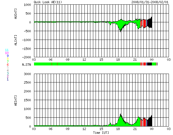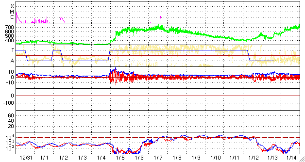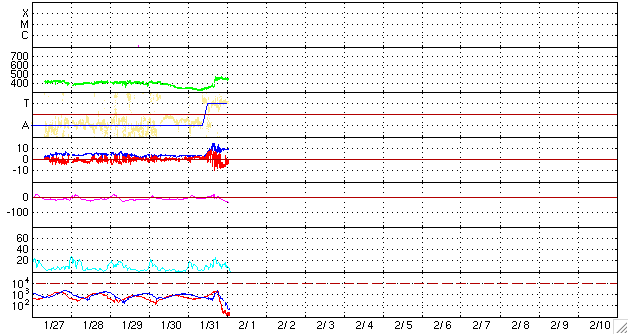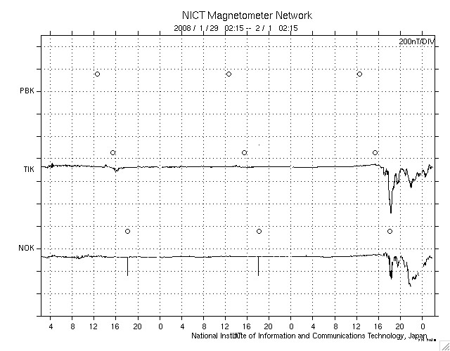 ACEが観測した太陽風の磁場(1番上の枠、白線は全体の強度、赤線は南北成分) および、太陽風の密度(3番目の橙線)、速度(4番目の黄線) (c) NOAA/SWPC ![]() リアルタイムAE指数 下段のAEグラフの値が高くなると、オーロラ活動が活発化しています。 (c) 京都大学, NICT ![]() シベリアで観測された3日間の磁場データ 右側の3分の1が、昨日のデータになります。グラフが上がったり下がったりすると、オーロラ活動が活発化しています。 (c) NICT ![]() 27日の太陽周期に合わせたデータプロット 太陽が同じ面を地球に向けていた27日前の変化から、今後を予想することができます。 (c) NICT