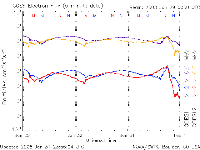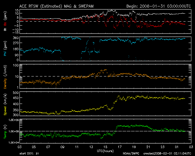 2008/ 2/ 1 11:12 更新 太陽風の乱れがやって来ました(450km/秒)。速度は更に上昇するでしょう。オーロラ活動も活発化しています。 担当 篠原 いよいよ高速の太陽風が始まりました。 昨夜、31日18時(世界時31日9時)に、密度(ACEの橙色線)が10個/cm^3に増加し、 続いて、磁場強度(白線)が強まり始めました。 31日23時(世界時31日14時)以降は、10nTに強まった状態が続いています。 磁場強度と同じくらいのタイミングで、速度(黄色線)も変化を始めました。 それまでの350km/秒から450km/秒に上昇して、そのまま安定しています。 高速風領域としては、まだ立ち上がったばかりで、 本格的な風はこれからやってくると思われます。 27日周期の図で、前周期(1月5日以降)の太陽風の変化を参考にしてください。 SOHO EIT195の太陽写真では、中心部にコロナホールが大きく広がっています。 今、地球へ向かって、勢いよく太陽風を吹き出しているところです。 磁場強度(白線)が強まっているため、 南向き磁場(赤線のマイナス成分)も大きく振れるようになり、 磁気圏活動が活発に始まっています。 AE指数では、500nTを超える中規模の変化が連続して起きています。 まだ、速度がそれほど高くないので、この程度で収まっているのでしょう。 この後速度が高まると、活動が更に活発化する可能性があります。 高速風は、2月6日くらいまで続くと予想されます。 ライブカメラでオーロラを見るなら、高速風の前半が有利です。 この週末はチャンスです。 放射線帯の高エネルギー電子は、一旦大きく下げています。 明日以降、高速風の影響で増加に転じると予想されるので、 今後の変化に注意してください。 太陽のフレア活動はとても穏やかです。 982黒点群は見えていますが、規模は小さく、穏やかです。 SOHO衛星のEIT195カメラの映像 (c) SOHO (ESA & NASA)