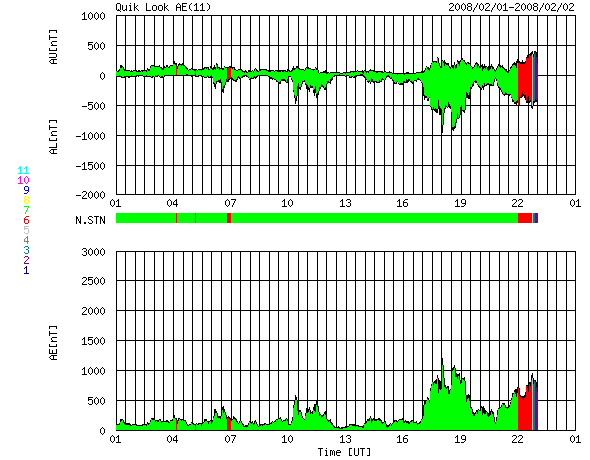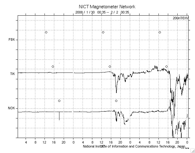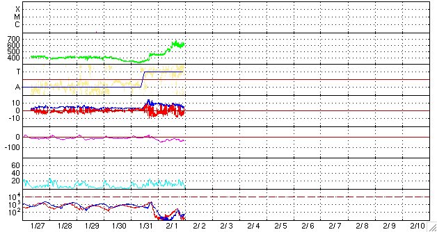 ACEが観測した太陽風の磁場(1番上の枠、白線は全体の強度、赤線は南北成分) および、太陽風の密度(3番目の橙線)、速度(4番目の黄線) (c) NOAA/SWPC ![]() リアルタイムAE指数 下段のAEグラフの値が高くなると、オーロラ活動が活発化しています。 (c) 京都大学, NICT ![]() シベリアで観測された3日間の磁場データ 右側の3分の1が、昨日のデータになります。グラフが上がったり下がったりすると、オーロラ活動が活発化しています。 (c) NICT ![]() 27日の太陽周期に合わせたデータプロット 太陽が同じ面を地球に向けていた27日前の変化から、今後を予想することができます。 (c) NICT
