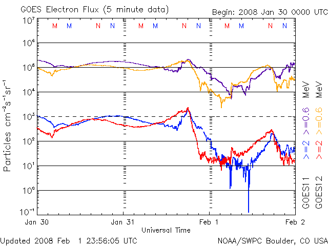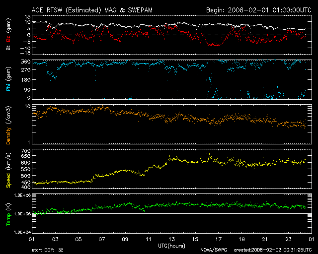 2008/ 2/ 2 09:32 更新 高速太陽風は、600km/秒台になりました。オーロラ活動も活発に発生しています。 担当 篠原 速度600km/秒台の本格的な高速太陽風がやって来ました。 昨日のニュースの後も、太陽風の速度はゆっくりと上昇を続け、 1日22時(世界時1日13時)に600km/秒に達しました。 コロナホール起源の高速風としては、かなり高まっている数値です。 その後、現在まで半日の間、600km/秒台の高速状態が安定して続いています。 磁場強度は10nTからゆっくりと下がる傾向を示し、現在は5nTと普通の強さに戻っています。 高速風としては、最高速度の領域に達したのでしょう。 大きな速度上昇とともに、オーロラの活動も活発化しています。 シベリア磁場データでは、昨日のところで一気に変化の幅が大きくなっています。 AE指数で詳しく見ると、 速度が上がりきった後半に、1000nTに達する大きな変化が発生しています。 この時間帯は、ACEのデータを見ると速度が高いだけでなく、 磁場が南向きになって、-5nTの状態が数時間続いています。 これが、激しいオーロラを起こすスイッチとなったのでしょう。 高速太陽風はまだ始まったばかりです。 27日周期の図による予想では、2月6日くらいまで高速状態が続きそうです。 SOHO EIT195の太陽コロナ写真を見ると、 コロナホールは太陽の中心部を通り過ぎようとしているところです。 今、高速風の最後の部分が地球へ向かって飛び出しています。 その風が地球へ達するのは3日後くらいですから、 6日に高速風が終わるというのは、妥当な見積りの様です。 この3日間くらいは、活発なオーロラ活動が期待できます。 ライブカメラにも注目してください。 放射線帯高エネルギー電子は、更に強度が落ちています。 明日くらいから増加を始めると思いますので、注意して下さい。 太陽は静穏です。 982黒点群は小さいままです。 SOHO衛星のEIT195カメラの映像 (c) SOHO (ESA & NASA)
