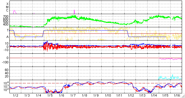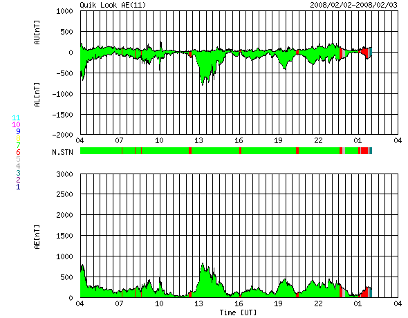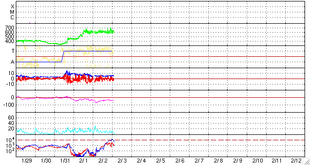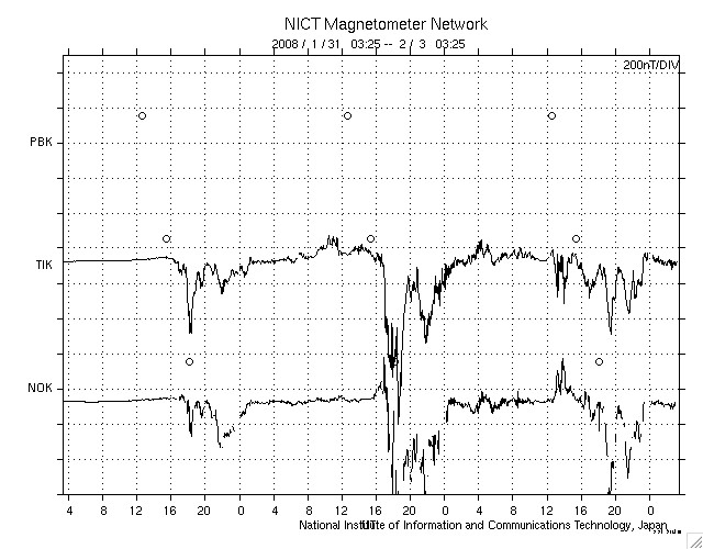 ACEが観測した太陽風の磁場(1番上の枠、白線は全体の強度、赤線は南北成分) および、太陽風の密度(3番目の橙線)、速度(4番目の黄線) (c) NOAA/SWPC ![]() リアルタイムAE指数 下段のAEグラフの値が高くなると、オーロラ活動が活発化しています。 (c) 京都大学, NICT ![]() シベリアで観測された3日間の磁場データ 右側の3分の1が、昨日のデータになります。グラフが上がったり下がったりすると、オーロラ活動が活発化しています。 (c) NICT ![]() 27日の太陽周期に合わせたデータプロット 太陽が同じ面を地球に向けていた27日前の変化から、今後を予想することができます。 (c) NICT
