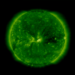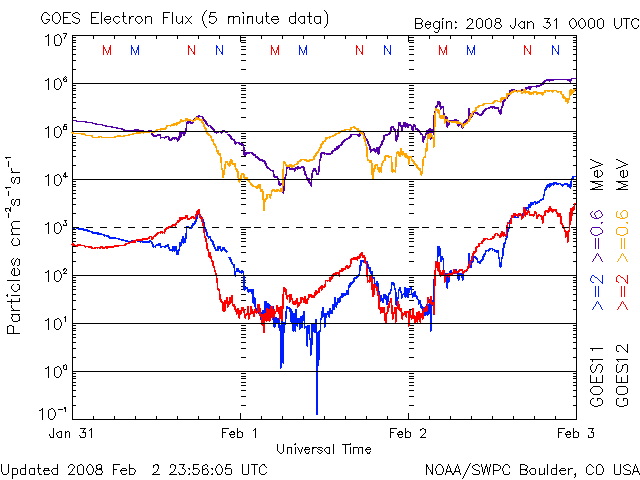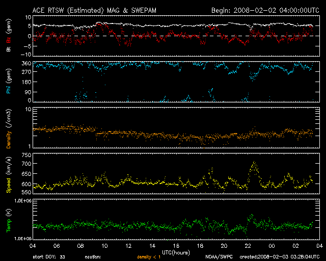 2008/ 2/ 3 12:29 更新 600km/秒の高速太陽風が続いています。オーロラ活動も続いています。 担当 篠原 引き続き高速の太陽風が続いています。 速度は600km/秒でほとんど一定しています。 磁場強度も5nTを保っています。 磁気圏のオーロラ活動も活発に続いています。 AE指数では、400nTから800nTくらいの中規模の変動が頻繁に見られています。 磁場の南北成分は、比較的短い時間南を向くような変化ですが、 速度がかなり高いので、オーロラ活動が起こりやすくなっている様です。 27日周期の図で見ると、現在、高速風は中間部にさしかかっています。 太陽風の磁場強度が、まだ弱まり始めていないことからも、 現在の高速状態がこのまま続きそうです。 高速の太陽風は6日くらいまで続くと予想されます。 オーロラ活動も、明日くらいまでは活発に見られるのではないでしょうか。 放射線帯の高エネルギー電子が、一気に数を増やしています。 青線のGOES11は、警戒レベルの10,000に達しました。 GOES12(赤線)は、まだそこまでは増加していません。 高速太陽風が続いていることから、このまま増加を続ける可能性が高いです。 衛星の運用などでは、注意が必要な状態になっています。 太陽では、982黒点群は小さくなっているようです。 今日の写真では、ほとんど見つけることができません。 X線の強度は低く、とても静穏です。 SOHO衛星のEIT195カメラの映像 (c) SOHO (ESA & NASA)