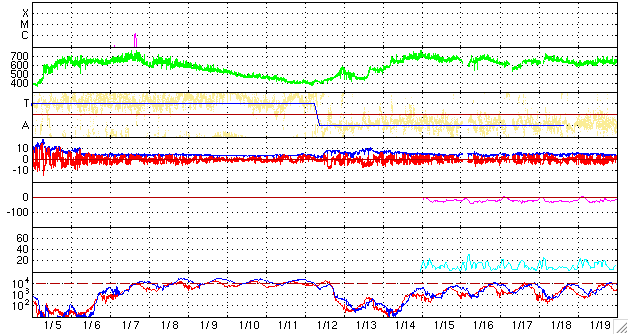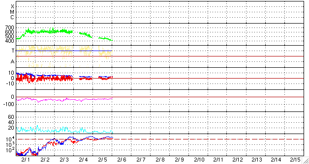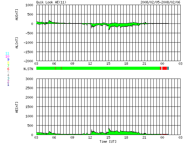 ACEが観測した太陽風の磁場(1番上の枠、白線は全体の強度、赤線は南北成分) および、太陽風の密度(3番目の橙線)、速度(4番目の黄線) (c) NOAA/SWPC ![]() リアルタイムAE指数 下段のAEグラフの値が高くなると、オーロラ活動が活発化しています。 (c) 京都大学, NICT ![]() シベリアで観測された3日間の磁場データ 右側の3分の1が、昨日のデータになります。グラフが上がったり下がったりすると、オーロラ活動が活発化しています。 (c) NICT ![]() 27日の太陽周期に合わせたデータプロット 太陽が同じ面を地球に向けていた27日前の変化から、今後を予想することができます。 (c) NICT