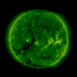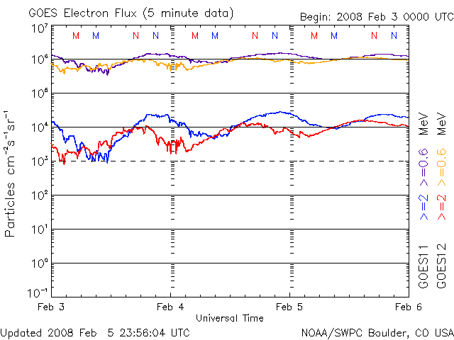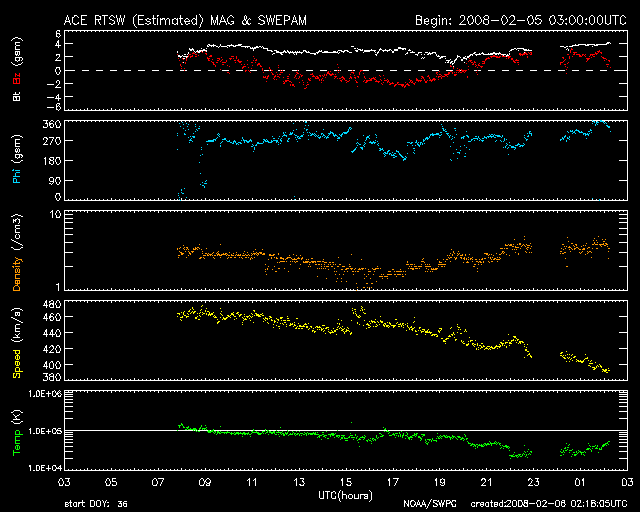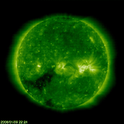2008/ 2/ 6 11:19 更新 太陽風の速度は下がりました(400km/秒)。放射線帯は強まったままです。 担当 篠原 太陽風の速度は下がり続けています。 現在、400km/秒に下がり、高速風は終わりました。 27日周期の図を見ると、終わりが1日半ほど早まった様です。 太陽風の磁場強度も、3-4nTとやや弱まった値で安定しています。 一時的に南向きに偏った時間帯があり、 そこで、小規模の磁気圏活動が発生しています。 しかし、速度が下がっているため、全体的には磁気圏は穏やかになっています。 今後の変化ですが、明後日くらいまで、このまま静かに過ぎて行くと思われます。 SOHO EIT195の太陽コロナ写真を見てください。 左の写真が最新の画像です。 東半球(左側)にコロナホールが複雑な形で分布しているのが見えます。 右の写真は、太陽がちょうど一回転する27日前の画像です。 こちらの写真でも、コロナホールは似た様な位置に見ることができます。 しかし、2枚の写真を比べると、 現在のコロナホールはより複雑になったというか、 細かい筋があちこちに伸びた姿に変わっています。 全体的な配置は変わっていませんので、 今後の太陽風の変化は、大まかには前周期の変化をたどることになるでしょう。 2月9日に入ったくらいから速度の上昇が始まります。 今度の高速風は継続期間が長く、9日間にわたって乱れた状態が続くと予想されます。 オーロラ活動も期待十分です。 EIT195の写真をよく見ると、コロナホールの先端(右端)が、 赤道を通り越して、北へ向かって伸びています。 この影響で、高速風の立ち上がり方に変化が見られるかもしれません。 しばらく楽しみに待ちましょう。 放射線帯高エネルギー電子は、警戒レベルの10,000を超えて安定しています。 次の乱れがやってくるまで、この高い状態は続くでしょう。 衛星の運用などでは、注意が必要です。 太陽では、982黒点群がとうとう消えてしまいました。 無黒点に戻っています。 新しい活動周期の黒点が現れて1ヶ月が経ちましたが、 なかなか後に続く黒点が現れません。 SOHO衛星のEIT195カメラの映像 (c) SOHO (ESA & NASA)